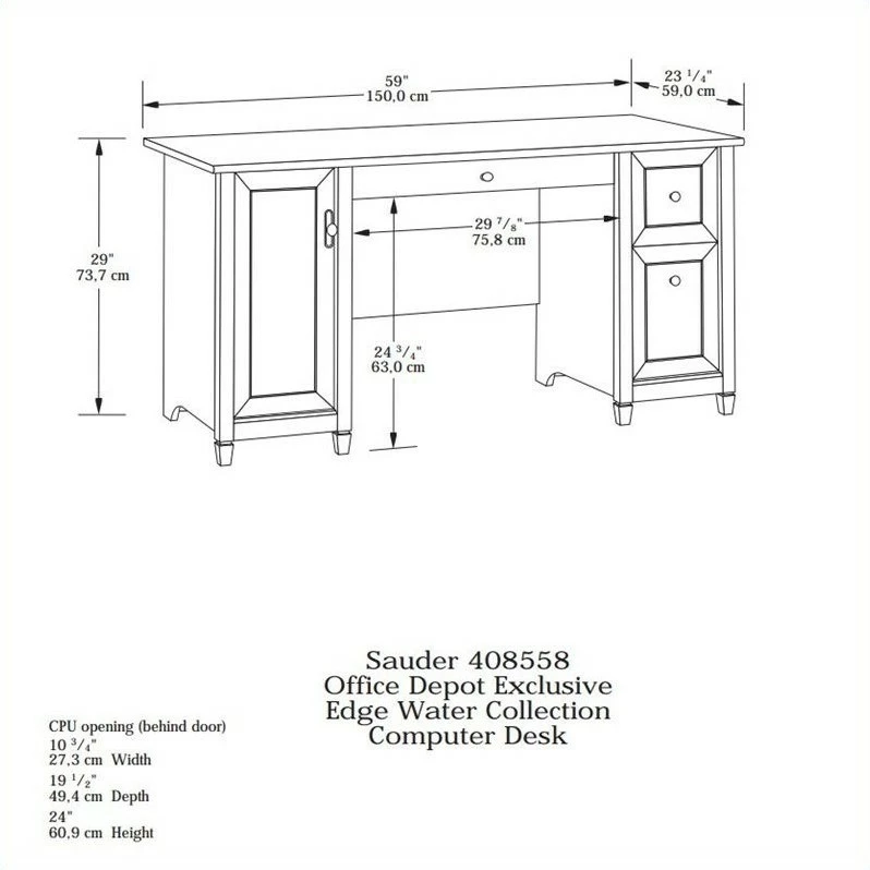 Work in style! Add some classic beauty to your office with this computer desk from the ® collection. It has a spacious tabletop with an ample amount of room for all your office essentials – laptop, paper, and of course your favorite coffee cup. This home office desk features a flip-down molding that reveals a slide-out keyboard/mouse shelf that includes metal runners and safety stops. This desk with storage also features two large drawers that open and close on smooth metal runners for easy access storage of miscellaneous office items. The lower drawer holds letter or European size hanging files so you can keep all your important documents organized. Behind the door is a hidden storage area that includes an adjustable shelf and accommodates a vertical CPU tower for a clutter free top surface space. Finished in Estate Black® with solid wood accents, this desk with file drawer is just what your office has been looking for.