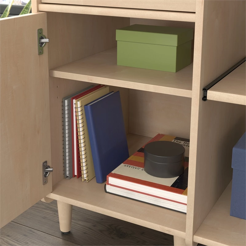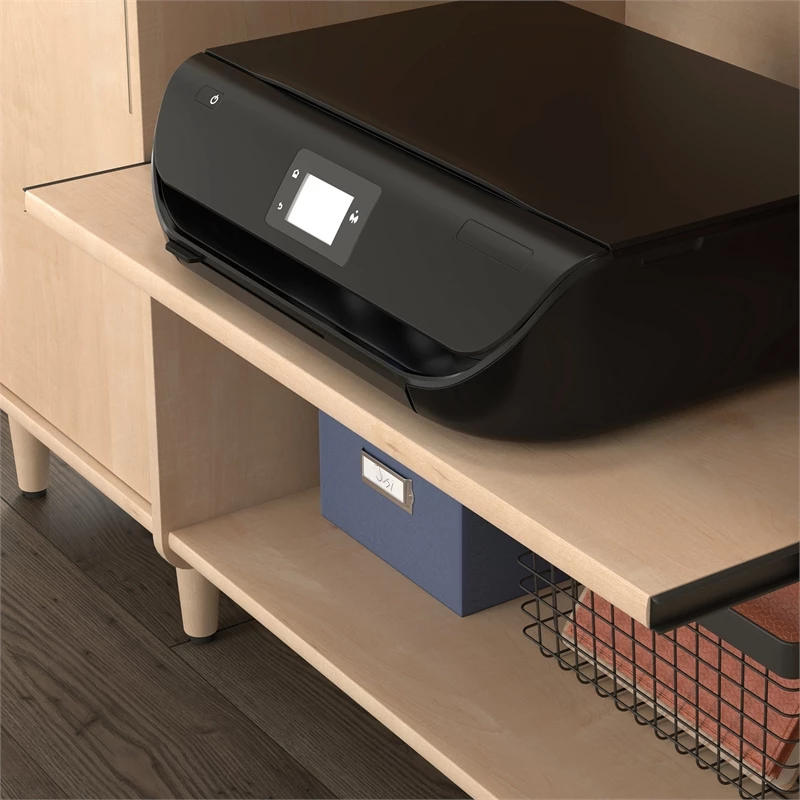 This home office credenza from the Clifford Place® collection brings a professional feel into your work-from-home office. This office storage credenza offers a spacious tabletop surface that provides you with room to display all your favorite home décor – a stylish accent lamp, a decorative plant, and photos of your family. This credenza with drawers also makes the perfect spot to set your keys as you walk in the door. This office credenza features two drawers that open and close on full extension slides. These easy gliding drawers offer the ideal amount of room to store and stash away extra office supplies, board games, home décor, and more. Behind each door is hidden storage that includes an adjustable shelf, making it a prime spot for items of various heights. The open storage in the center includes a slide-out printer shelf so you can easily access your printer or other office equipment. This office storage furniture also features a grommet hole and pass-through so you can keep all your cords and wires neatly out of the way. Finished on all sides in Natural Maple and accented with solid wood feet, this storage credenza can be used in any room of your home.