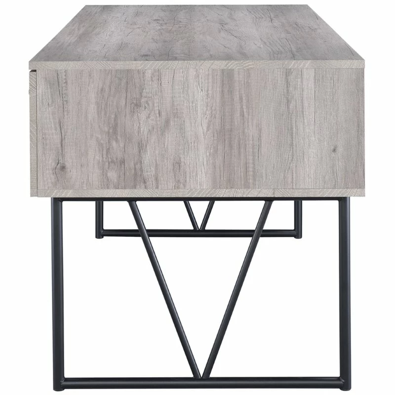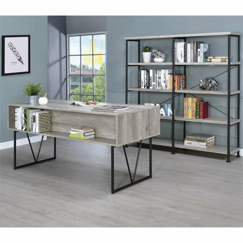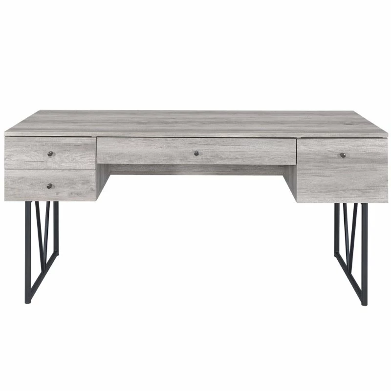 This handsome writing desk combines minimalist design with industrial function. It’s fashioned with four drawers complete with full extension glides for convenient storage capacity. The table top has wood grain accents that evoke character and warmth as well as space for all necessary work materials. The metal base and legs have a black finish that’s a magnificent contrast to the gray driftwood design. Up your productivity with this desk that’s ideal for any office space.