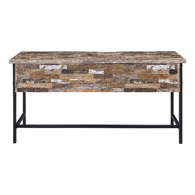 This charming writing desk, finished in salvaged cabin wood, is a great choice for those looking for a piece with character and personality. A contrasting metal frame finished in black complements the piece ‘s rustic, weathered wood well. The desk also features four drawers with full extension glides, for convenient storage and accessibility.