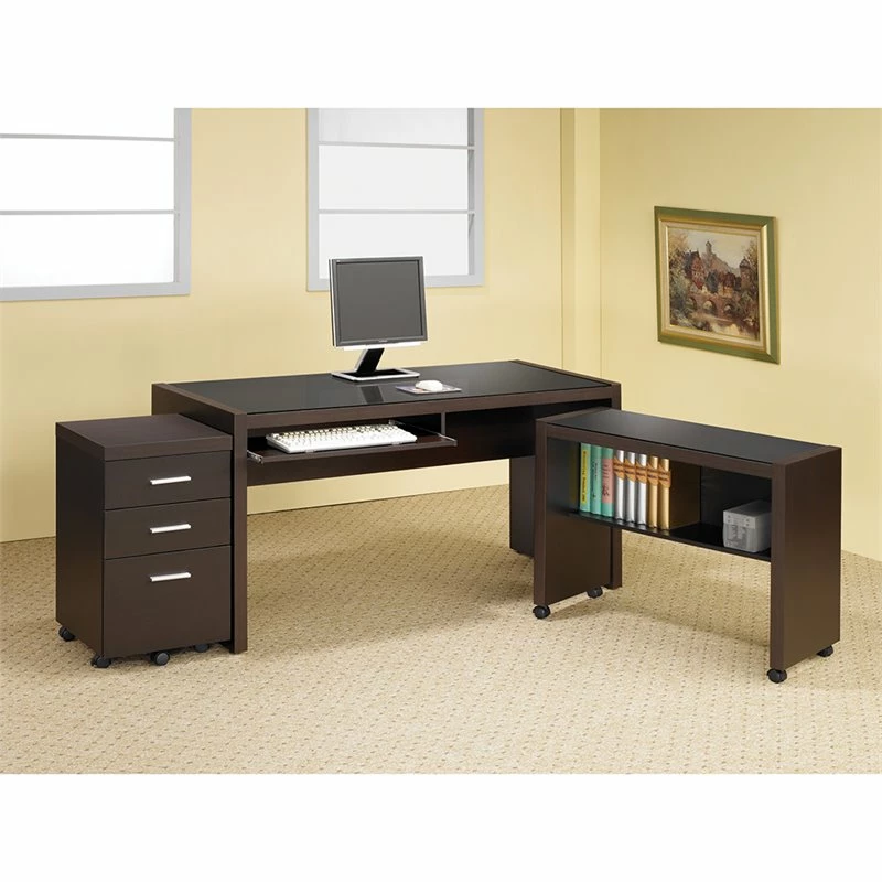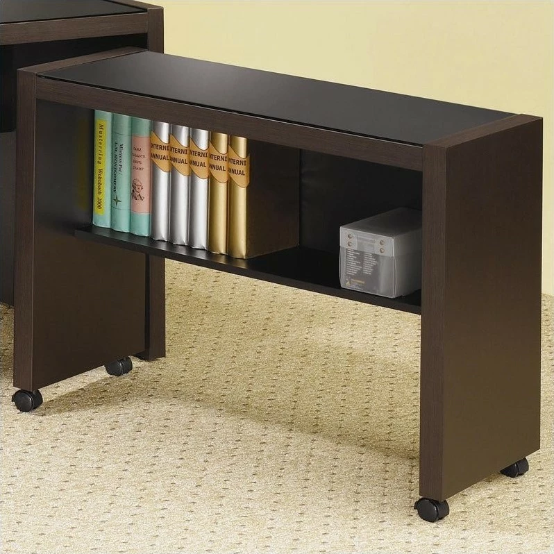 Expand storage space in an office configuration. Beautifully designed, this mobile return offers plenty of room to stash books and implements. A cappuccino finish creates a bold, dramatic feel. Adorned with classic silver hardware, its contemporary creds stand out. Caster wheels make mobility a snap.