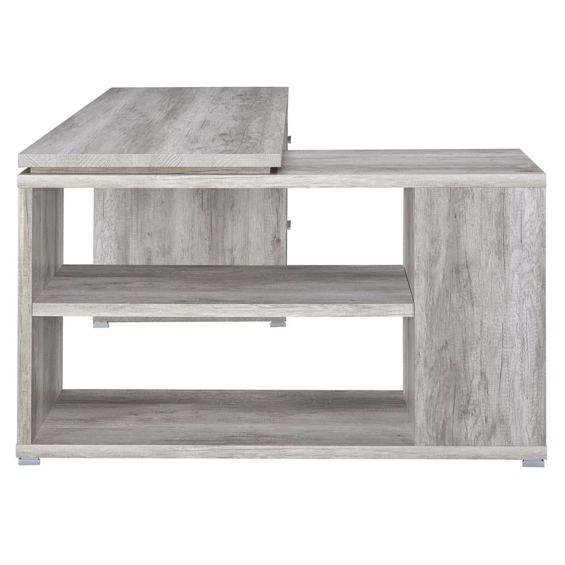 This alluring L-shaped office desk offers the stylish workspace needed to hit any deadline. It features open shelves and three drawers as well as a built-in filing cabinet. It’s expertly crafted with particle board, MDF, and engineered veneer that’s provides reliability and durability. The L-shaped desk top accommodates widescreen monitors and a lamp as well as a set of dictionaries and research books. It also has a reversible set-up to conveniently match whatever office design you have.