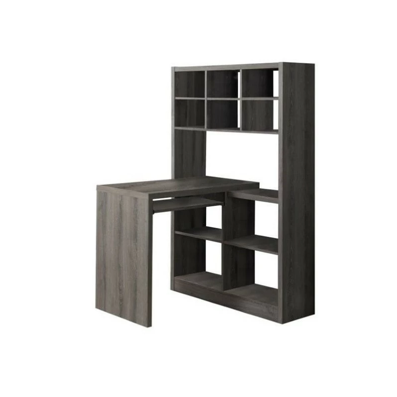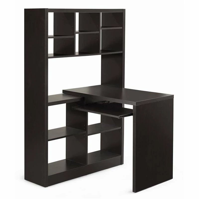 This unique, contemporary style desk and shelf unit offers the ideal combination for your home office. Finished on all sides in an elegant espresso, the thick paneled desk features an easy glide pull-out keyboard tray and ample side storage space which can be positioned to the left or right of the desk allowing you to customize your space as needed. The convenient attached bookcase with adjustable shelving provides plenty of space to store books, paperwork, or decorative objects. A versatile design piece to place anywhere in your home and office space.
