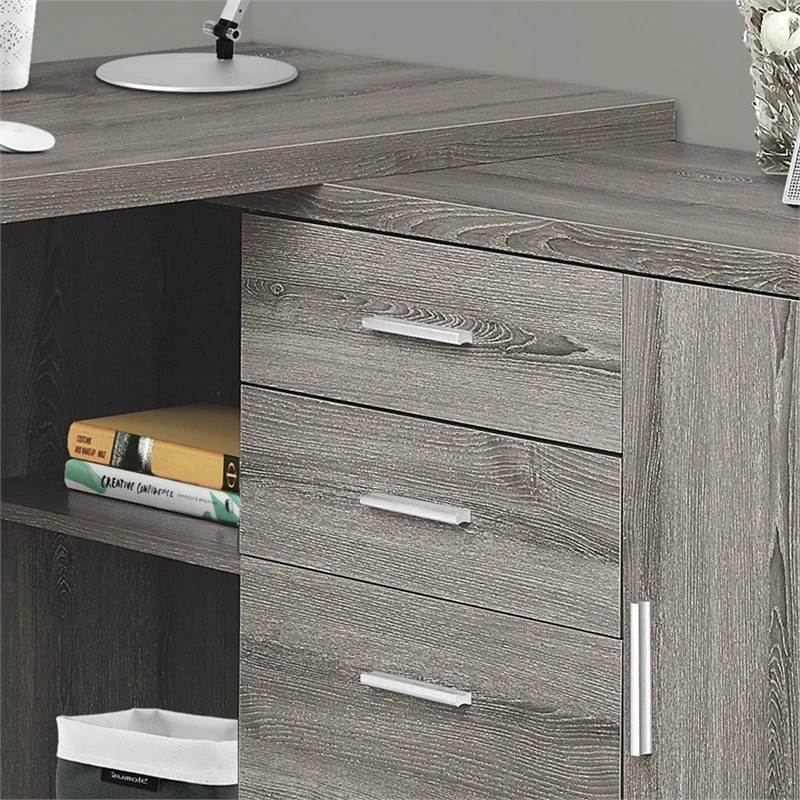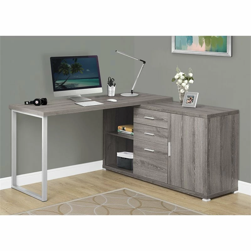 Choose how best to organize your workspace with this corner desk offering a reversible configuration and multiple storage options. This L-shaped desk in a dark taupe wood-look finish features a storage unit that can be installed on the left or right. It includes 2 cubbies with 1 adjustable shelf panel, 3 storage drawers in 2 sizes, and 1 cabinet with 1 adjustable shelf panel. The large, main desktop panel is supported by a robust, rectangular metal leg in a silver finish and overlaps the storage unit to create a second, lower worksurface. This L-shaped computer desk saves space when used in a corner but is finished on all sides for a polished look wherever it is placed in a home office.
