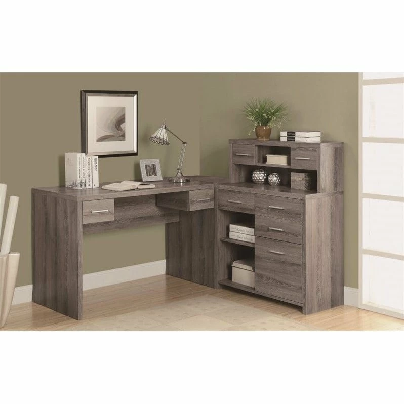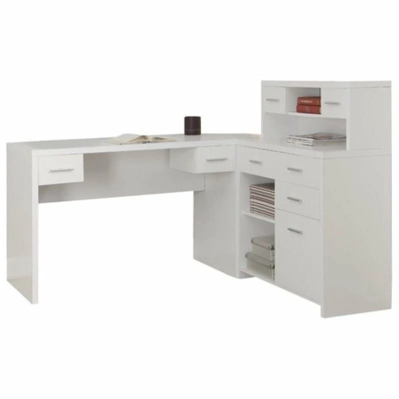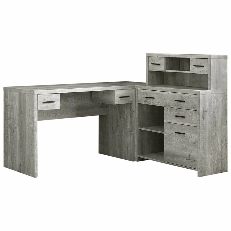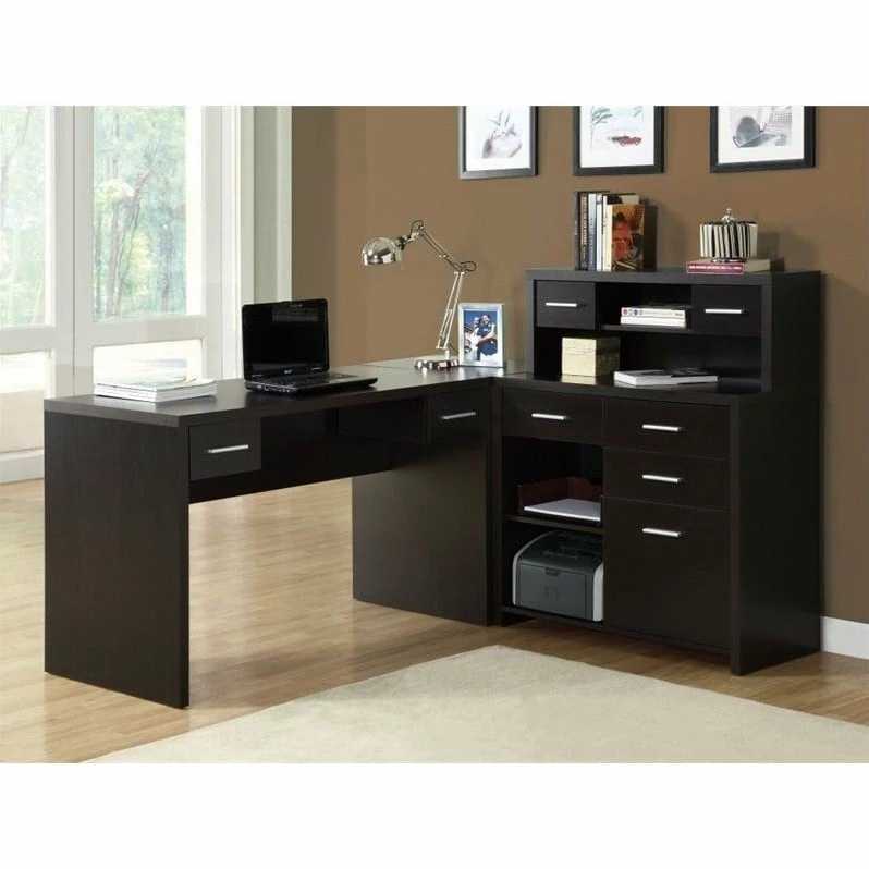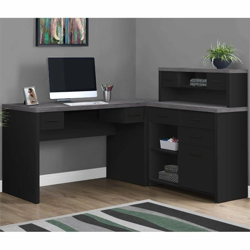 The contemporary appeal of this rich black and gray wood-look L-shaped workstation, finished on all sides, upgrades your home office with functional storage and style. The spacious, thick paneled desk has two work surfaces which can conveniently be assembled on the left or right hand side, or even placed side by side. There is ample space for a computer or laptop, a place to write and spread out your documents. This computer workstation also features abundant drawer storage, all on smooth easy glide metal, a hutch and 3 open shelves, including an adjustable shelf, keeping all of your essential supplies within easy reach. This desk storage unit is a must-have for any home office.