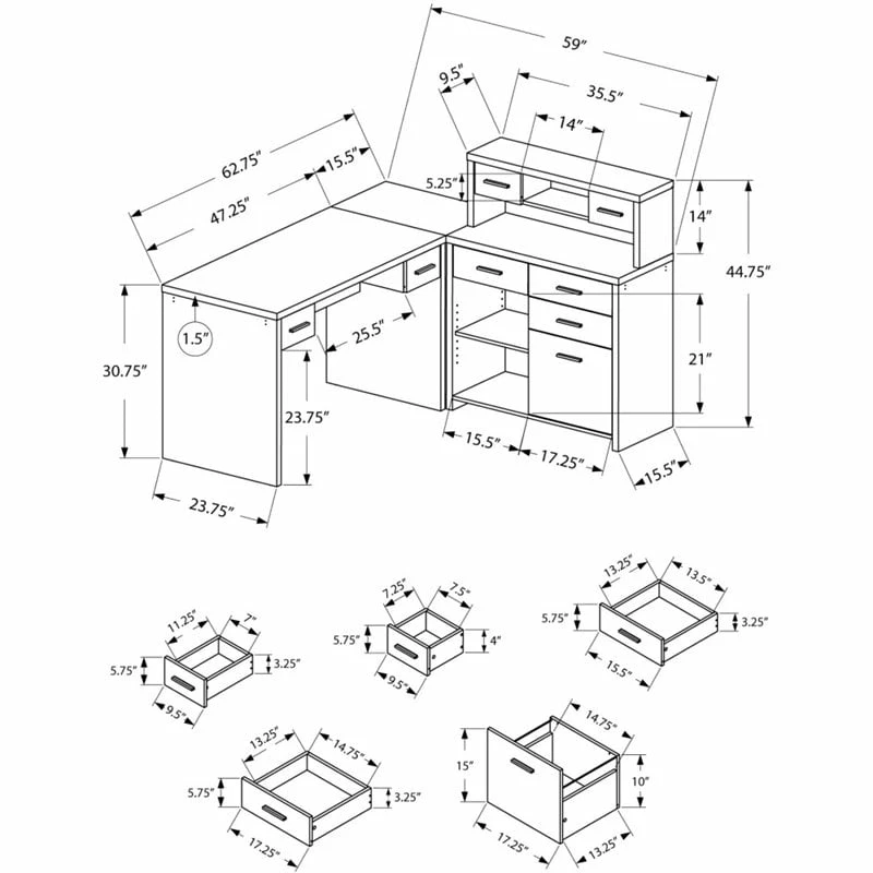 - Drawer Dimensions : (Desk) 5.75″ H x 7.5″ W x 11.25″ D
