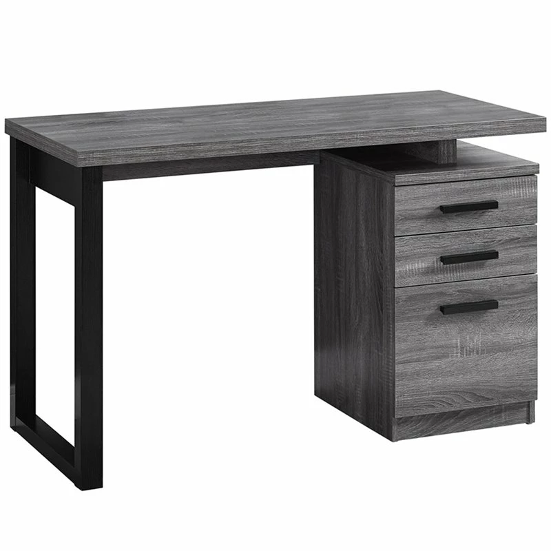 This computer desk with 3 storage drawers can help you optimize your home office space and your productivity. Its thick-panel, floating desktop offers room for the essentials you need to work plus allows you to use the top of the drawer unit as an extra surface. Finished in the same grey wood-look laminate as the desktop, the drawer unit includes 2 small drawers and 1 large drawer for hanging files so you can keep the desktop clutter free. For convenience, the drawer unit is reversible and can be installed on the left or right side according to your preference. Supporting the desk is a robust, rectangular wooden leg in a complementary black finish.