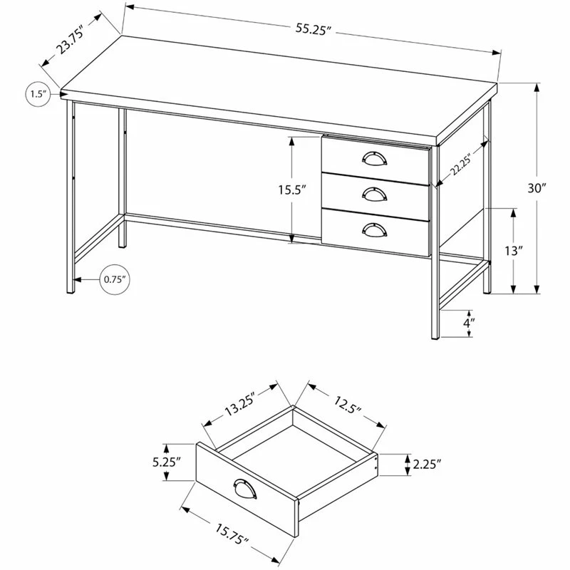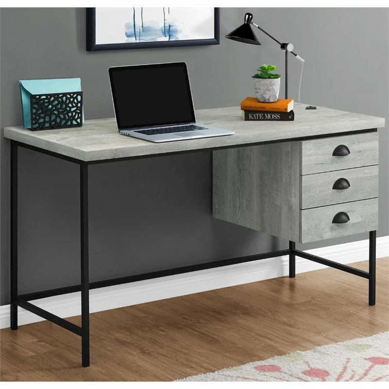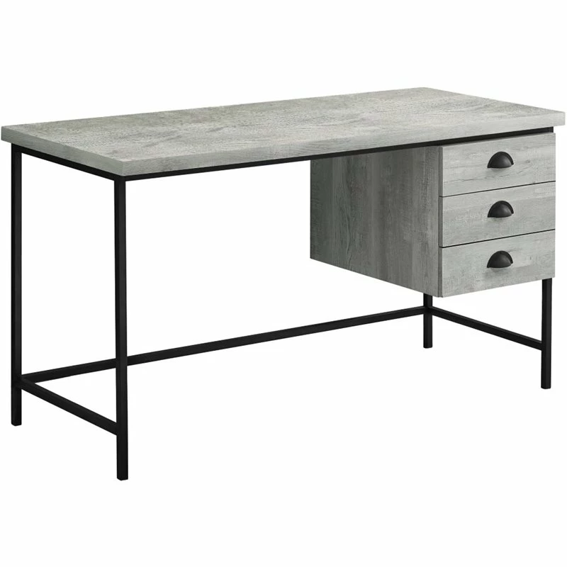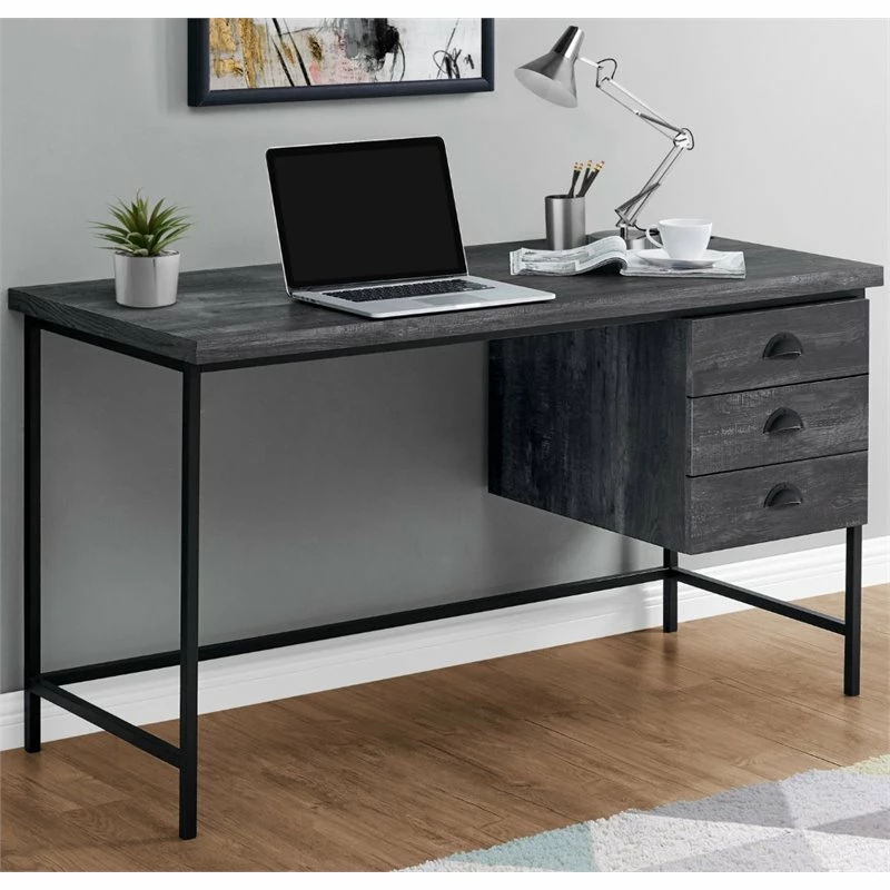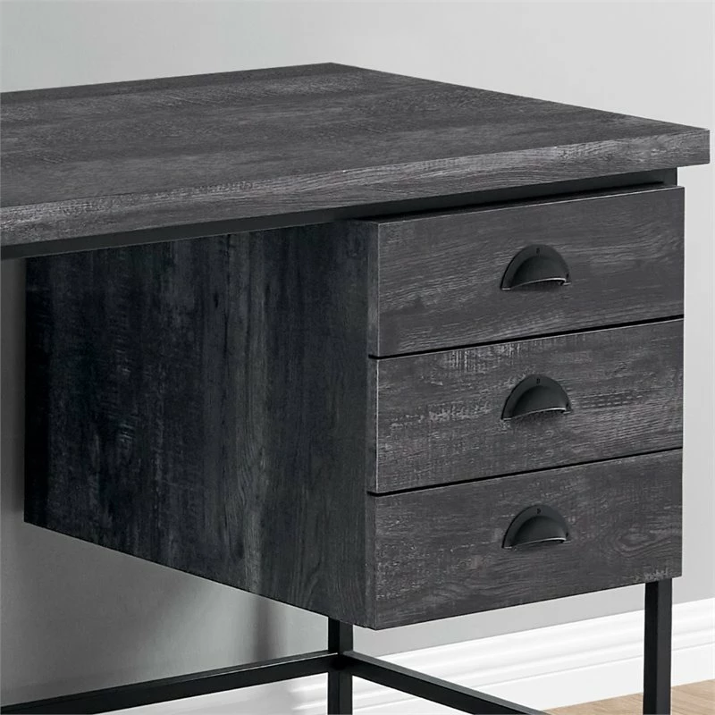 Add some style with practical substance to your work space with this simple and contemporary, clean-lined computer desk. The smooth laminate, in a sophisticated black reclaimed-wood look finish on all sides, is offset by the industrial inspired black square tube metal leg for a modern element. The 3 storage drawers on metal glides are accented with black metal cup style drawer pulls, keeping your office essentials tucked away but within easy reach. The compact size is ideal to place this desk in a hallway, bedroom, or any designated home office space. Assembly is required.