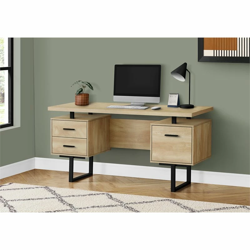 Feel like a boss in your home office when you sit down to work at this mid-size computer desk with 3 storage drawers. The thick-panel floating desktop provides generous room for a laptop and writing materials, and allows you to use the tops of the drawer units as extra surfaces. Finished in the same natural wood-look laminate as the desktop, 2 small drawers and 1 large drawer with a bar for hanging files offer space for items you want to keep off the work surface. For flexibility, the drawer units are reversible and can be installed on either side according to your preference. Supporting the desk are metal legs in a black finish with a modern, stylish U shape.