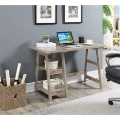 The Designs2Go Trestle Desk by Convenience Concepts has a variety of key features. With two fixed shelves that provide plenty of space for the extras – such as files, books, or even supplies- you will be able to keep all your work tools at your fingertips.. The perfectly sized desk top has ample space for computer, keyboard and mouse. All the necessities and then some. The sleek contemporary design is just an eye pleasing plus.