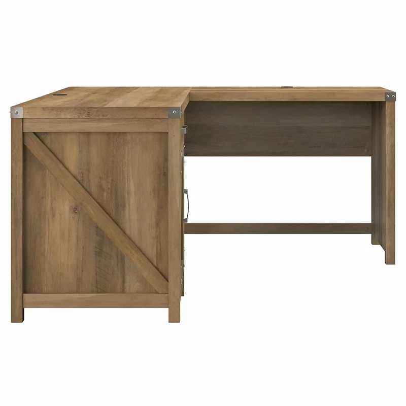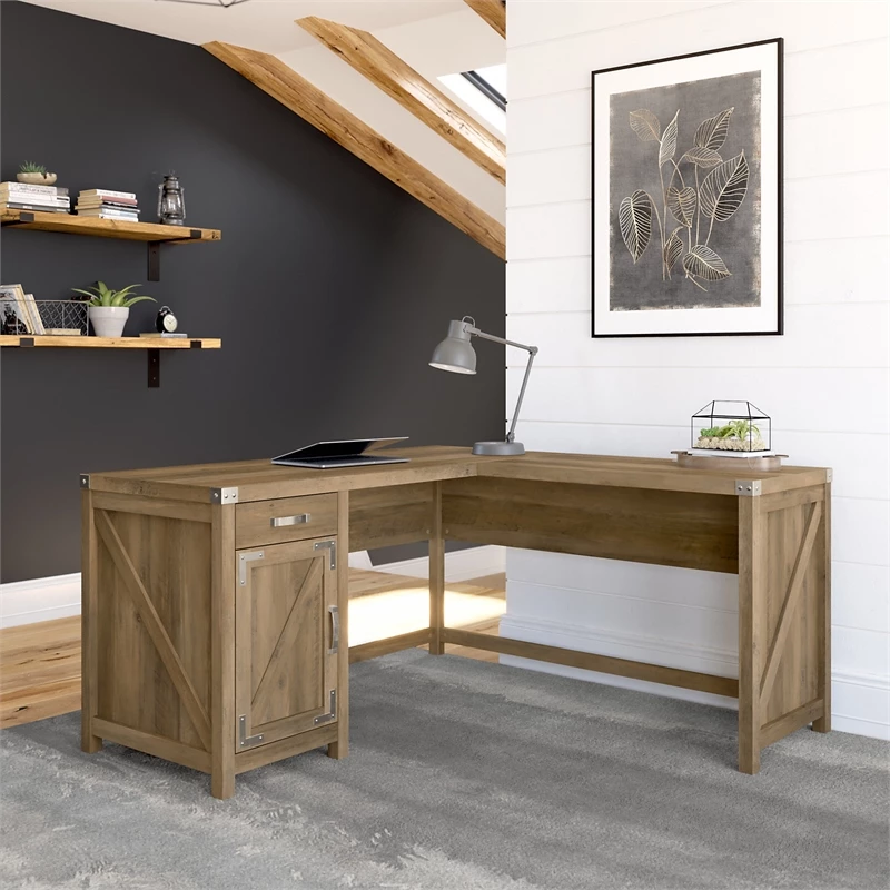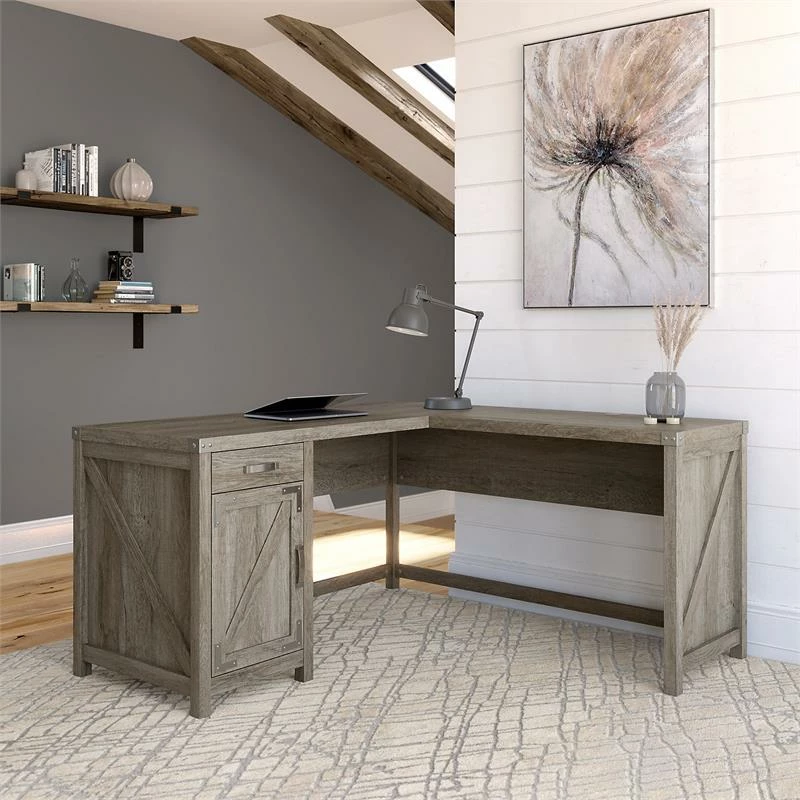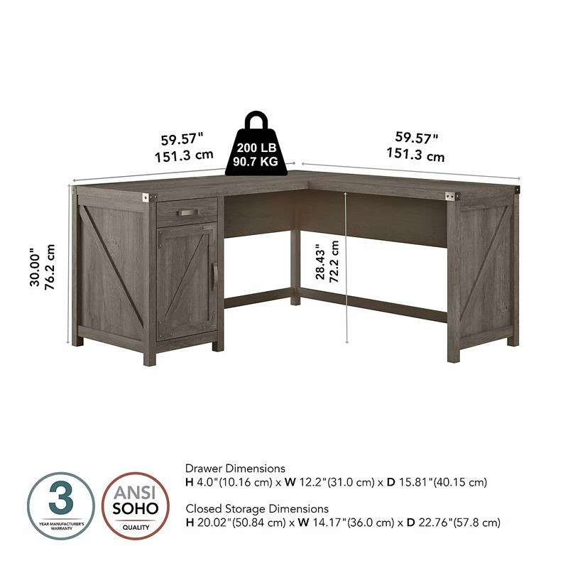 The kathy ireland® Home by Bush Furniture Cottage Grove 60W L Shaped Desk with Storage offers a personal workspace solution with appealing modern farmhouse style. Spread out with a computer, reference materials and more on a durable corner desk surface that extends 60 inches in each direction and supports up to 200 pounds. The desktop also includes built-in wire management to keep pesky cords and cables out of the way as you take on your next project or assignment. Additional materials and home office supplies can be stashed neatly inside the Desk’s storage cabinet and box drawer. Save space in compact areas by placing the L Desk in a corner or make use of the finished back to take a prominent position facing out into the room. This corner computer desk with storage has been tested to meet ANSI/SOHO standards for safety and performance and is backed by a 3 Year Manufacturer’s Warranty. Materials: Engineered wood and laminates