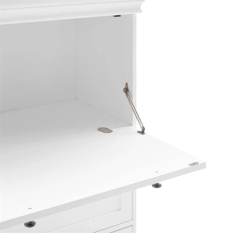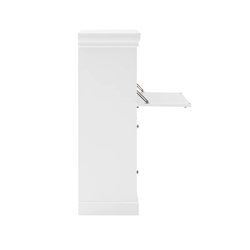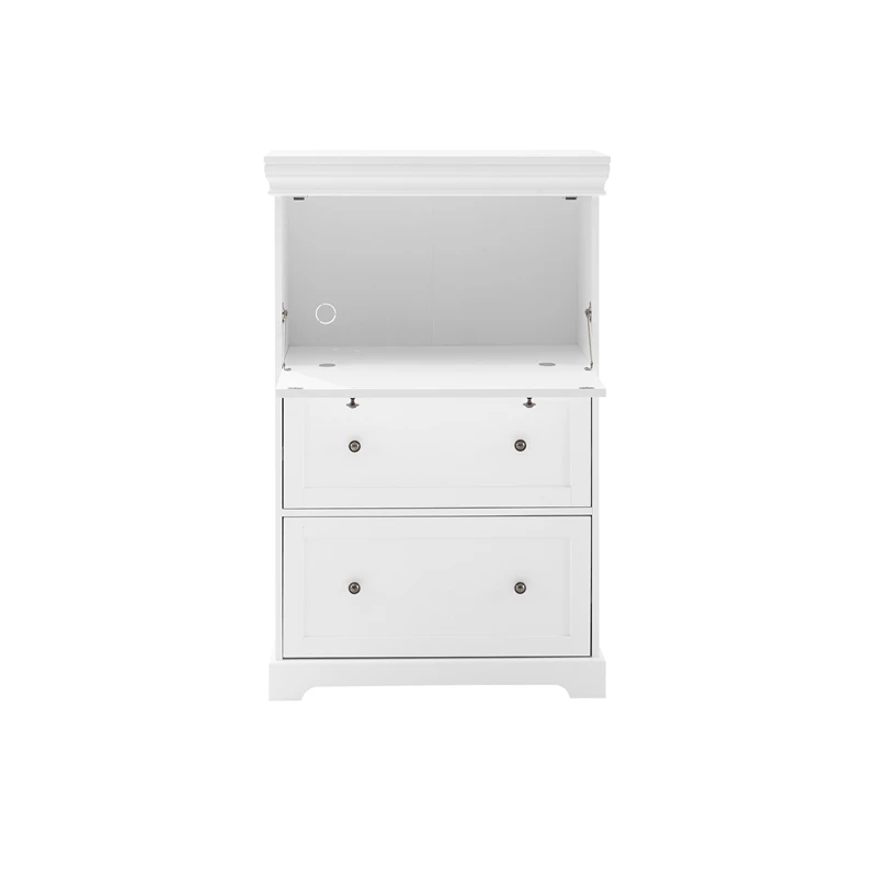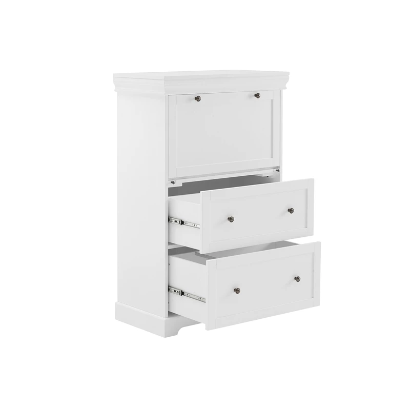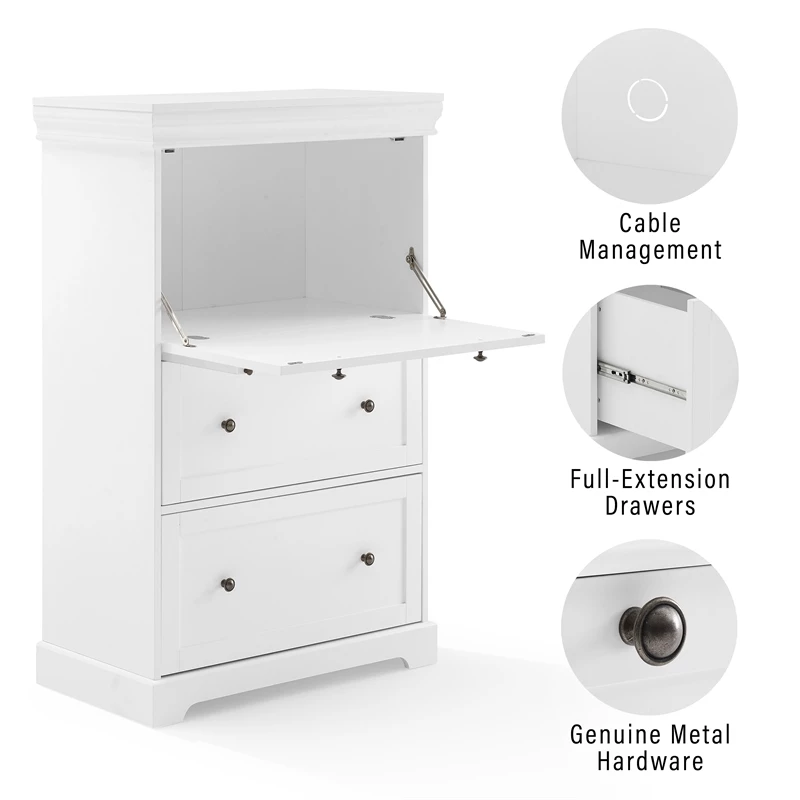 Traditional hideaway desks are usually large striking pieces of furniture, high on style and function. The Alena secretary desk brings that same energy to a smaller, space-saving package. Featuring a drop-down desk for a laptop plus space for an external monitor, you’ll have everything you need at your fingertips. Once your workday comes to an end, everything can be neatly stored behind the folding desktop. With one file drawer and one full-extension drawer, this office armoire will keep you organized and clutter-free.
