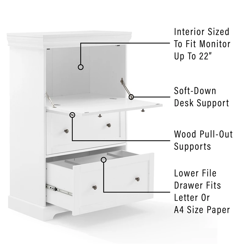 - Interior desk compartment sized to fit a computer monitor up to 22″