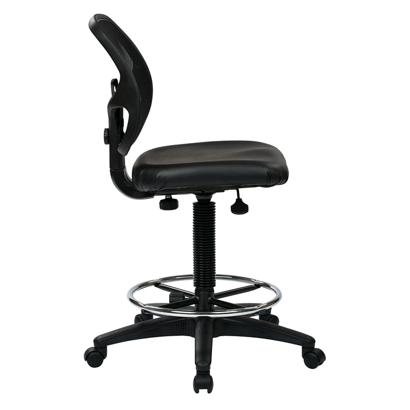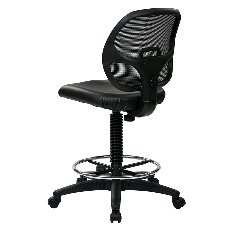 This GREENGUARD certified drafting chair is fashioned with a deluxe mesh back for breathability and an adjustable foot ring to accommodate any size. The vinyl seating gives this chair a corporate look with casual feel. With one-touch pneumatic seat height adjustment and back height adjustment, this accommodating piece is perfect for anyone looking for the perfect marriage of comfort and style.