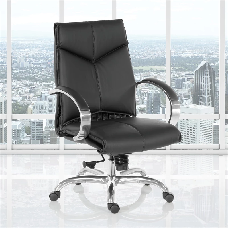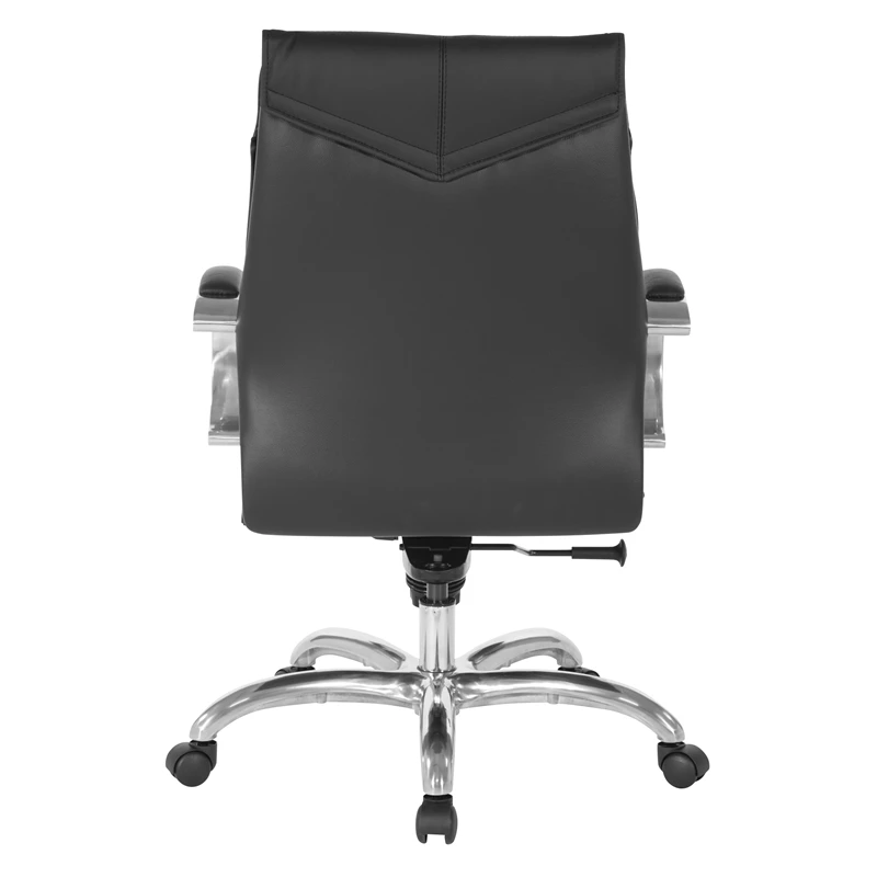 Bring a well designed professional appearance to any office with our Deluxe Executive Leather Mid-Back Chair. This Pro-Line II® chair features contour seat and back with built-In lumbar support, one touch pneumatic seat height adjustment. Locking mid pivot knee tilt control with adjustable tilt tension. Other features include soft padded chrome arms and black Top Grain Leather on all seating surfaces. Complete with heavy duty chrome base with dual wheel carpet casters and is GreenGuard indoor Air Quality Certified and backed by a limited lifetime warranty.