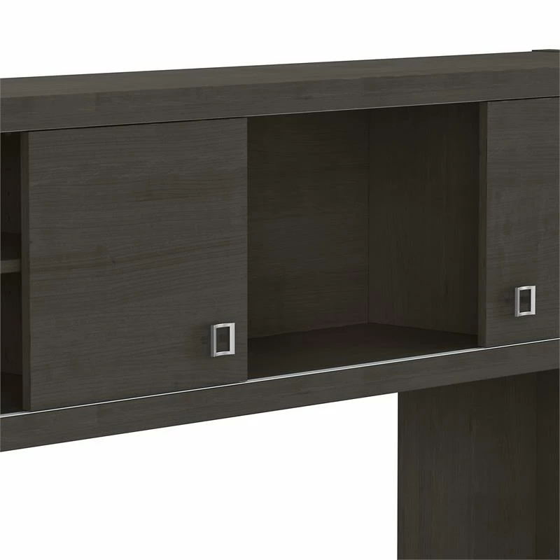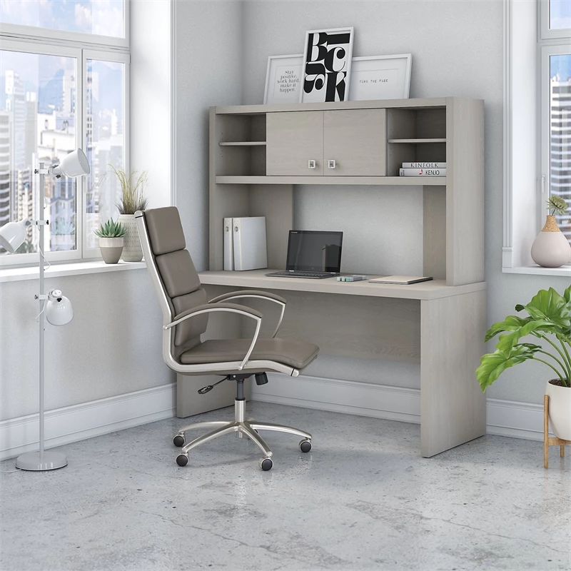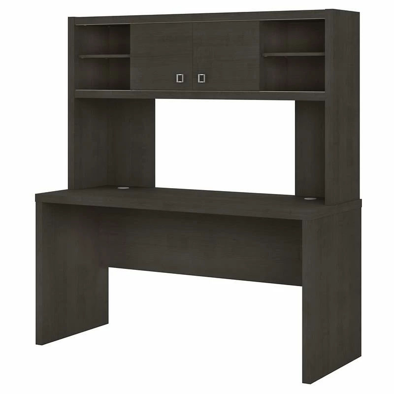 The Office by kathy ireland® Echo Credenza Desk with Hutch offers an elegant, functional design to inspire today’s professional. Wide lines and a thick, durable surface create a strong presence while a thermally fused laminate finish protects the office desk throughout years of everyday use. Spread out on the spacious 60W surface with your computer, paperwork or any other tasks of the day. Adding the coordinating Hutch makes organizing your workspace simple. Each outer compartment in the Hutch contains an adjustable shelf, and sliding doors offer flexible placement in the center or on the ends for concealing work materials or displaying decorative accents. From Office by kathy ireland® and Bush Business Furniture, Echo comes with a 3 Year Manufacturer’s Warranty and meets ANSI/BIFMA quality standards for safety and performance.