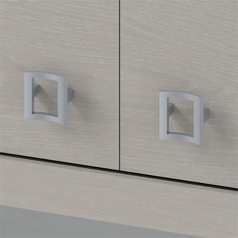 - Your choice of Pure White or Gray Sand finishes and Satin Silver hardware create a contemporary charm