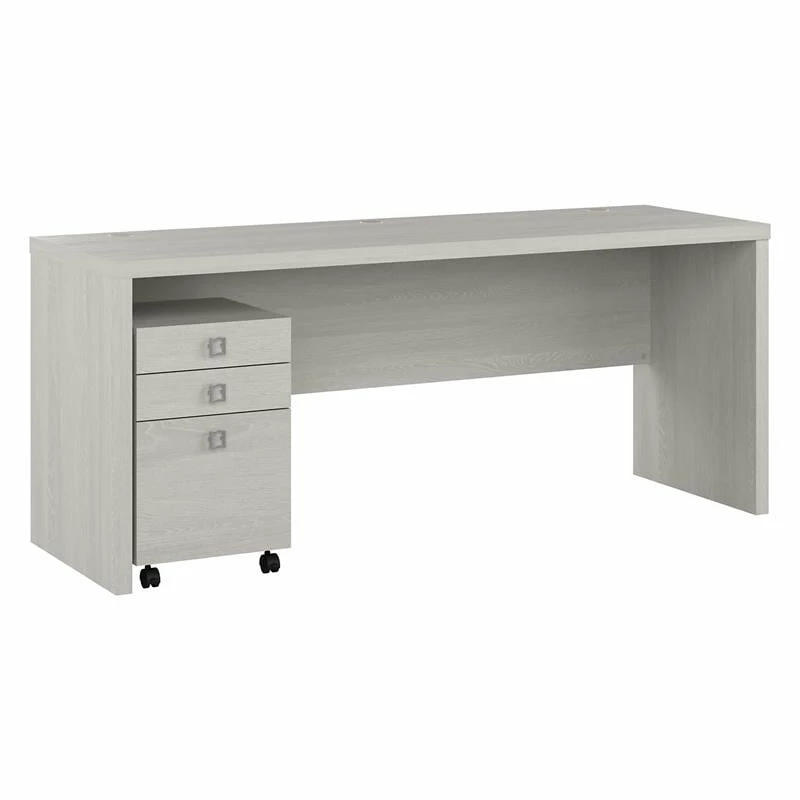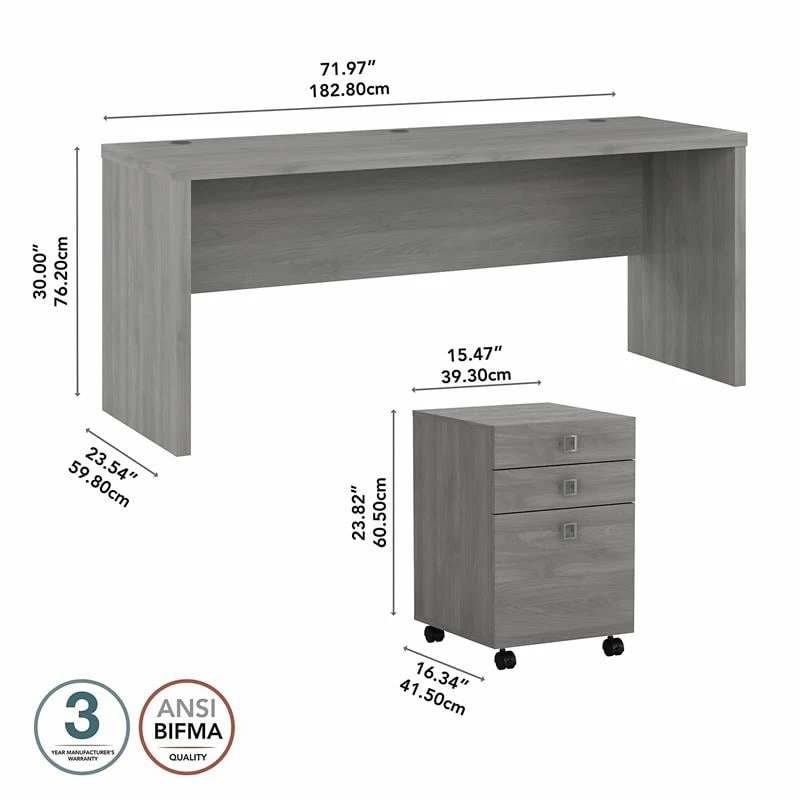 The Office by kathy ireland® Echo 72W Computer Desk with 3 Drawer Mobile File Cabinet creates a strong presence perfect for those whose passion for business is only matched by their fashionable tastes. Spread out with a computer, reference materials, paperwork and more on a spacious 72-inch desktop that supports up to 200 pounds. The durable thermally fused laminate surface protects against scratches, stains and other cosmetic damage to preserve the modern office desk’s elegant appearance throughout years of daily use. Organization is made easy with the rolling File Cabinet, which provides two box drawers to store small office supplies and a file drawer that holds letter, legal and A4-size documents. This Computer Desk with Drawers has been meticulously tested to meet or exceed ANSI/BIFMA quality standards for safety, durability and performance and is backed by a 3 Year Warranty.