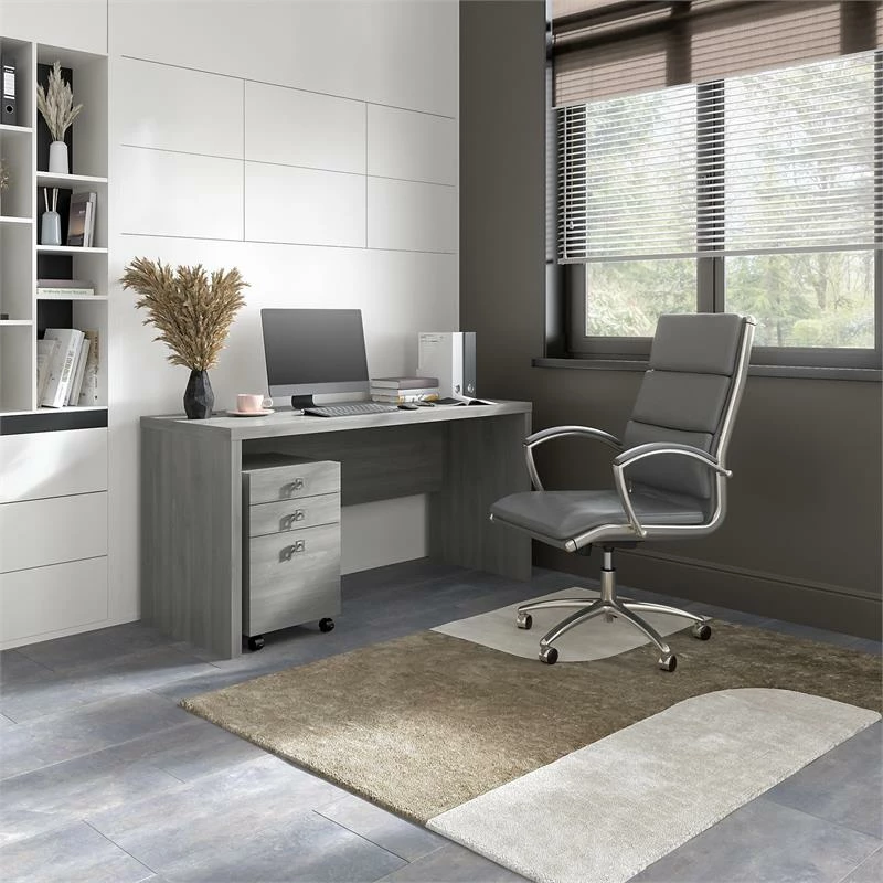 The Office by kathy ireland® Echo Credenza Desk with Mobile File Cabinet offers an elegant, functional design to inspire today’s professional. Wide lines and a thick surface create a strong presence while a thermally fused laminate finish protects the office desk throughout years of use. Spread out on the spacious 60 inch desktop with your computer, paperwork or any other tasks of the day. Organization is made easy with the Mobile File Cabinet, which provides two box drawers to store office supplies and a file drawer that opens on full-extension ball bearing slides for an easy reach to letter size documents. The filing cabinet rolls effortlessly on dual-wheeled hooded casters and can be locked in place for secure positioning anywhere, including under the Credenza. From Office by kathy ireland® and Bush Business Furniture, Echo comes with a 3 Year Warranty and meets ANSI/BIFMA standards. Materials: Engineered wood and Laminates.