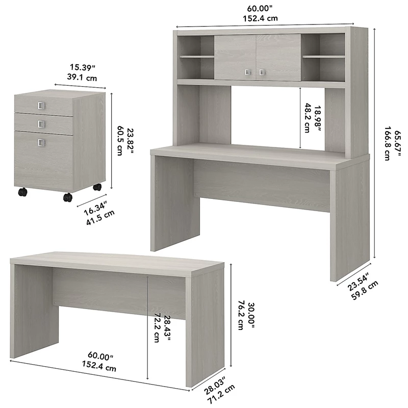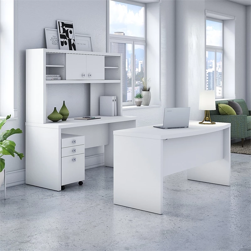 The Office by kathy ireland® Echo Bow Front Desk, Credenza with Hutch and Mobile File Cabinet creates a strong presence perfect for those whose passion for business is only matched by their fashionable tastes. A durable thermally fused laminate finish endures years of everyday use to maintain the elegance of the office desks. Spread out on the spacious 60W surfaces with your computer, paperwork or any other tasks of the day. Organization is made easy with the rolling File Cabinet, which has two box drawers to store office supplies and a file drawer that holds letter-size documents. The Desk Hutch provides a concealed storage area in between two open compartments with one adjustable shelf each. From Office by kathy ireland® and Bush Business Furniture, Echo comes backed by a 3 Year Manufacturer’s Warranty and has been tested to meet ANSI/BIFMA quality standards for safety and performance.