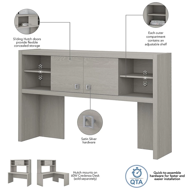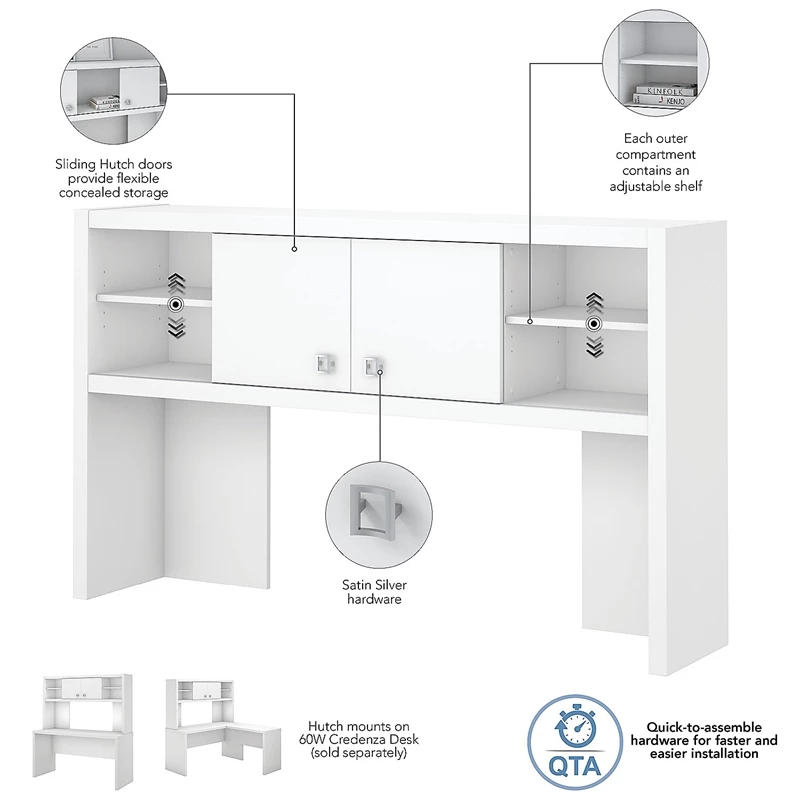 - Credenza Desk with Hutch provides a secondary work area that boasts plenty of storage for materials