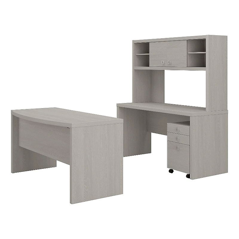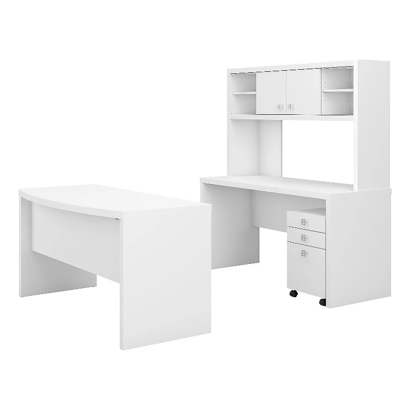- Bundle includes: 60W Bow Front Desk, 60W Credenza, 60W Hutch, 3 Drawer Mobile File Cabinet