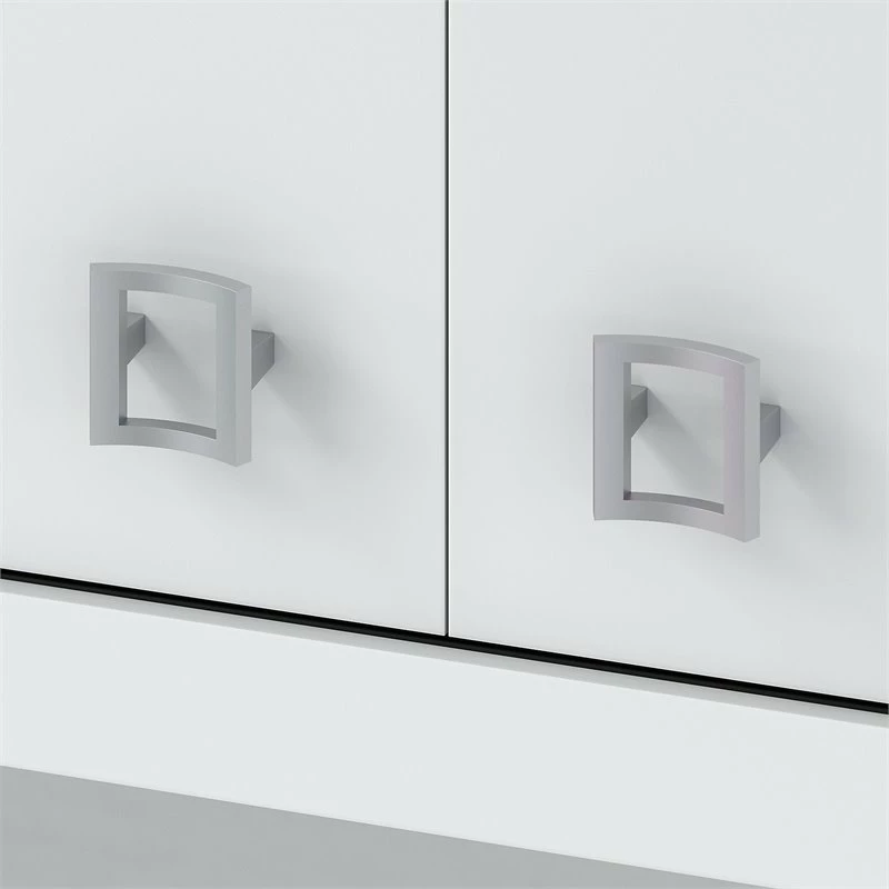 - Pure White finish and Satin Silver hardware create a contemporary charm