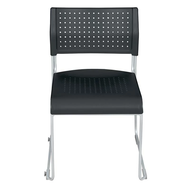 Welcome to a new generation of stack chair! The Eris is simple, stylish and durable. A perforated back allows for air flow and is curved for maximum comfort. The seat’s waterfall edge makes for a more comfortable seat, no matter the user’s attire. The sturdy sled base is finished in an attractive chrome and the Black polypropylene seat & back are durable and easy to clean, making the Eris perfect for classrooms, breakrooms, waiting rooms, libraries, anywhere you need a simple, attractive and modern seating solution. The notched feet on the bottom of the base are designed to gang together, making setting up training rooms or row seating a breeze. These chairs easily stack together when not in use for space saving storage.