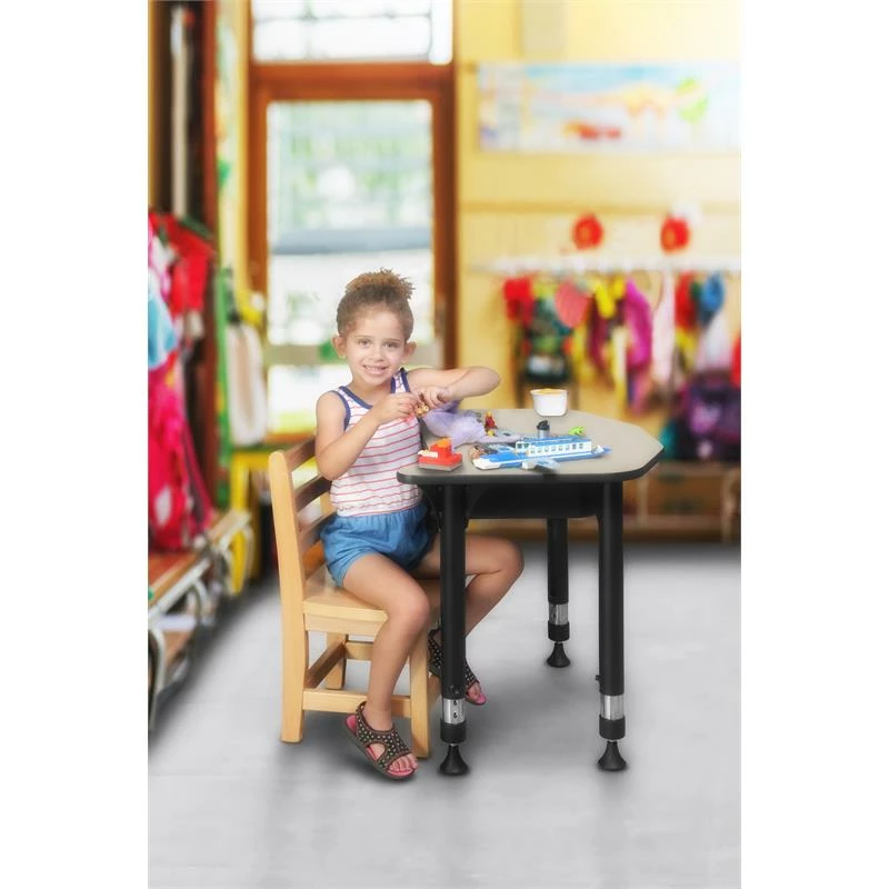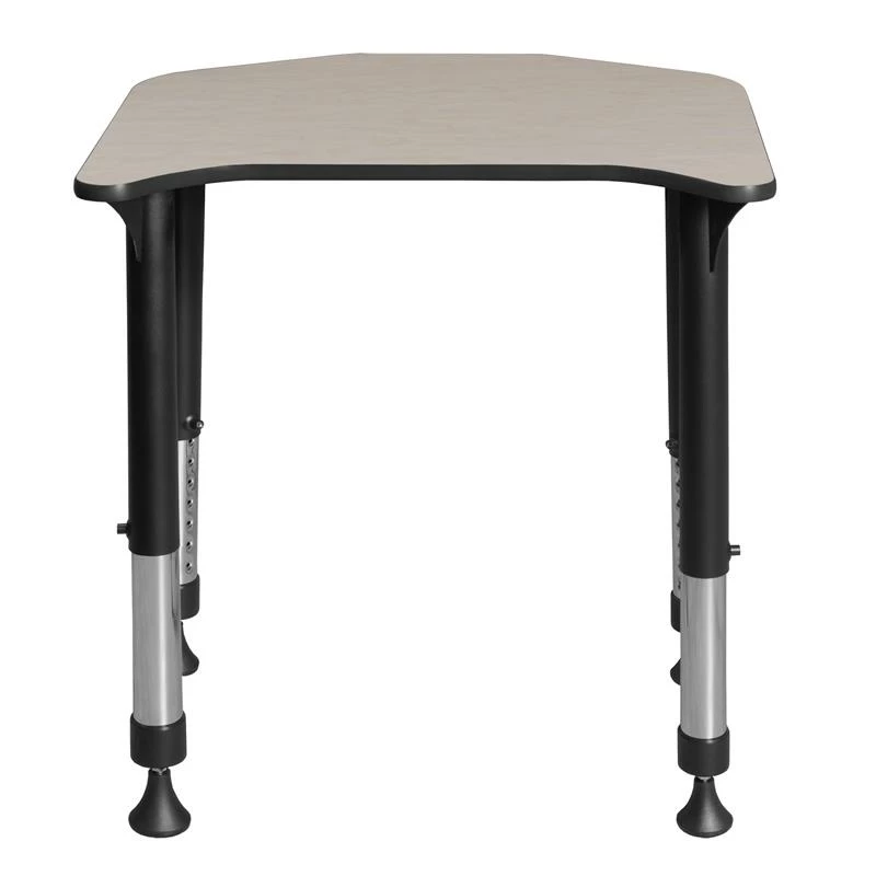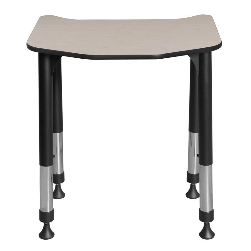 This Specialty Shaped Height Adjustable School Desk is ideal for rooms with students of all ages. Kee adjustable post legs come four to a set and are height adjustable to accommodate students of all ages. Height is easy for adults to adjust by loosening and tightening a bolt with the included hex key. This 26-inch long and 24-inch deep student desk assembles in a snap with just a few screws. The desktop is constructed of a thermal fused melamine Maple laminate tabletop that is 3/4-inch thick and finished with a black edge band. Laminates are scratch, stain and scald resistant and wipe clean easily. Rounded corners make the table safer for everyone. A sleek alternative to pedestal style bases, the adjustable post legs come in a classic black with chrome underneath. Adjustable glides on the bottom of the base ensure a level desktop and are easy to adjust.