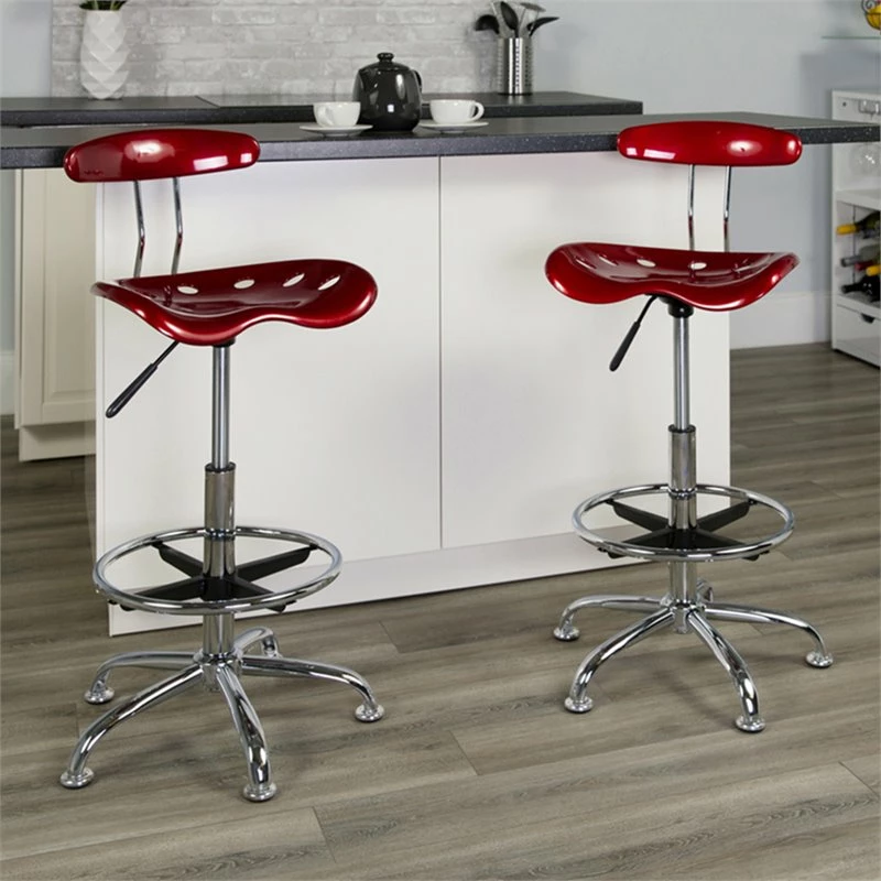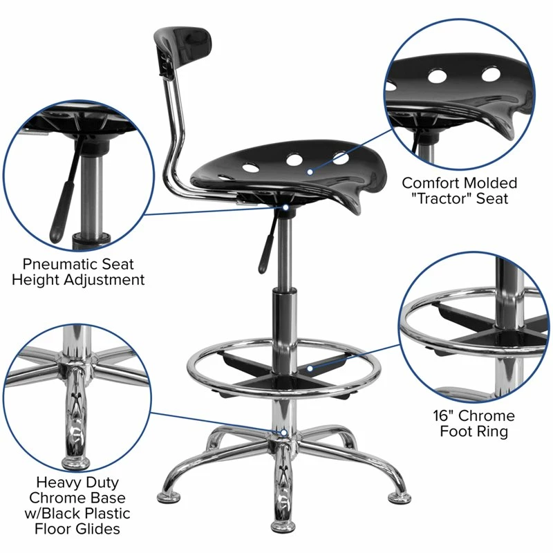 If you need a chair that is versatile enough for the workbench in your garage, stand-up desk in your home office and the island in your kitchen then this cherry tomato drafting stool with tractor seat is just the ticket. The back and swivel seat are made from high-density polymer for durability and a sleek, shiny finish and can be cleaned with a solvent and water based cleaner such as foam. Easily raise or lower the height of this drafting chair using the pneumatic adjustment lever, conveniently located under the seat. Plastic floor glides protect your floor by sliding smoothly when you need to move it and the heavy-duty, chrome base and foot ring complement the stool’s modern design. This contemporary drafting stool with comfort molded tractor seat combines leading edge style with great functionality.