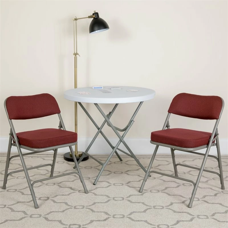 Ensure that your guests, clients or parishioners pay more attention to you than the clock with these ultra-comfortable folding chairs. Folding chairs are a practical choice for social activities and everyday use in the home due to their compact storage capabilities. These metal folding chairs are commercial grade to withstand heavy and daily usage in any industry. Take your regular group meetings outdoors instead of staying in a stuffy room or host beautiful outdoor events with the arrangement of these padded folding chairs. While suitable for outdoor use store indoors to protect the frame from extreme moisture. Its 18-gauge triple braced curved steel frame supports up to 300 pounds while the non-marring floor glides protect your flooring from scuffs and scrapes. The uses are endless with multi-purpose chairs to fulfill your seating needs for your business or home. With nothing to assemble these chairs come ready to service your needs.
