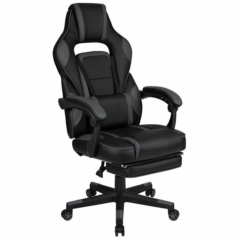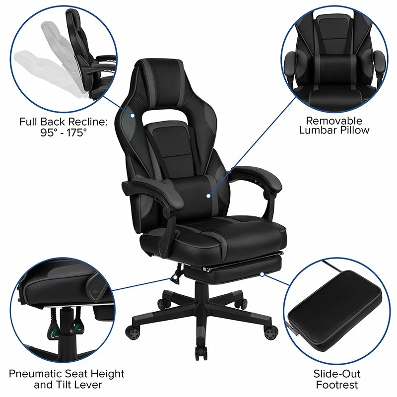 You’re going to enjoy playing on this high-performance racing gaming chair with massaging lumbar and slide-out footrest. This modern gaming chair is paired with an ergonomic gaming desk. with an adjustable and removable headrest pillow and massaging lumbar pillow. For maximum support this office chair with footrest engages by pulling the loop then flipping the footrest up to elevate your feet and has a separate lever to recline the back 87° ~ 145°. Plug in the 3 foot USB cord to get a relaxing massage from the lumbar pillow. The black top extra large gamers table features a removable mouse pad top, can hold up to two monitors and has two grommets for cable management. Always know where your headset is with the included headrest hook while you keep your desktop and pc gaming keyboard clear of accidental spills by placing hot and cold beverages in the cup holder. Your online followers will know that you’re serious when they see you in your reclining gaming chair with footrest.