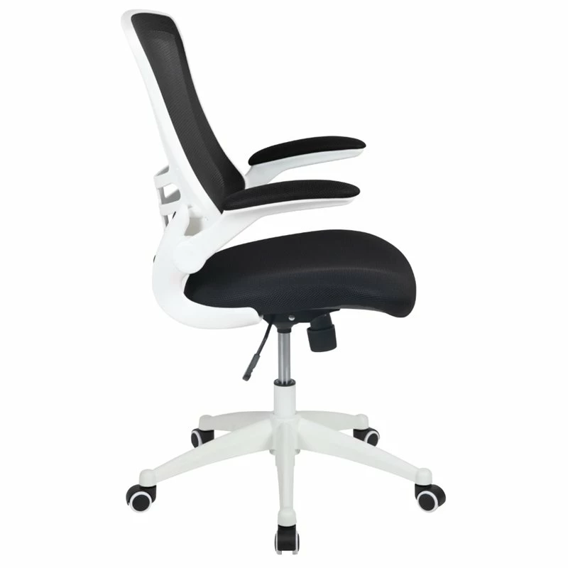 Break free from the norm of conventional office seating with this ultra-modern white frame office chair. The mesh back swivel ergonomic task office chair will exceed your needs in comfort and style. Beat those hot summer days with the ventilated mesh back behind you, offering up huge airflow. The curved backrest has lower lumbar support to provide you with good posture support. This well-built ergonomic office chair has flip-up arms that provide relief to your shoulders and neck but is also great for users who prefer an armless design. The arms flip out of your way when you want to roll your chair underneath the desk and not have to adjust the seat height. Adjusting the seat height is easy with the pneumatic lever. Turn the tilt tension adjustment knob underneath the seat to increase or decrease the amount of force needed to rock or recline. Whether meeting deadlines, chatting with colleagues, answering phones or perusing the internet this contemporary swivel office chair will meet your needs in your professional workspace or in your home office.