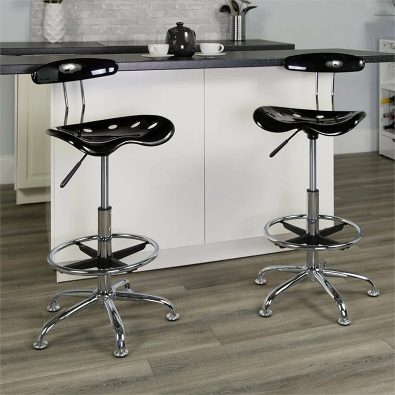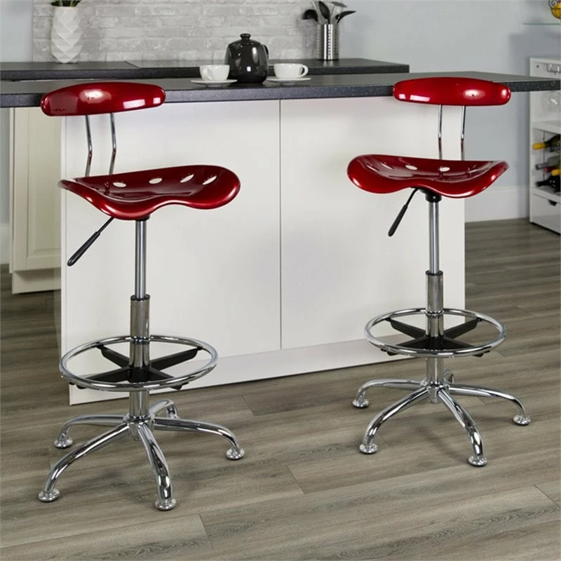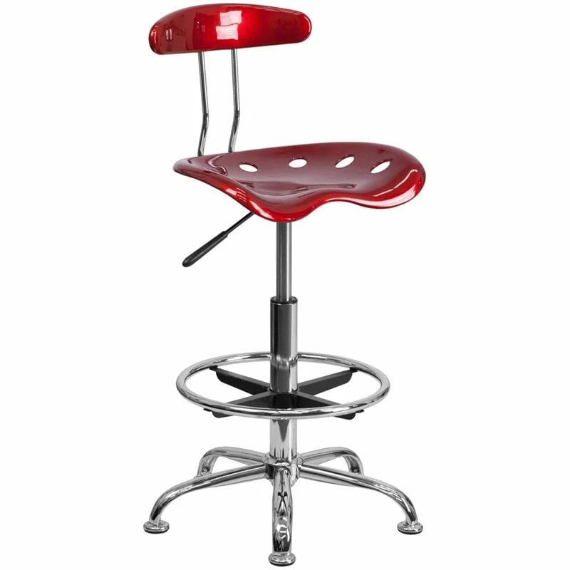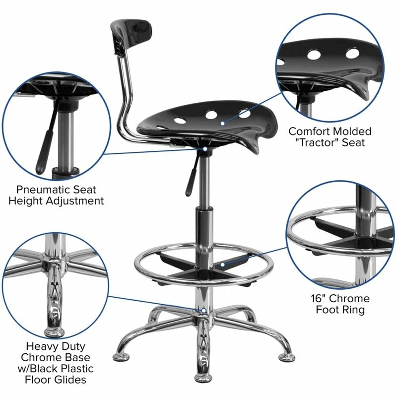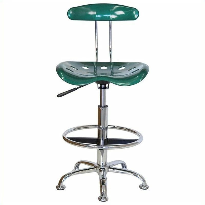 If you need a chair that is versatile enough for the workbench in your garage, stand-up desk in your home office and the island in your kitchen then this green drafting stool with tractor seat is just the ticket. The back and swivel seat are made from high-density polymer for durability and a sleek, shiny finish and can be cleaned with a solvent and water based cleaner such as foam. Easily raise or lower the height of this drafting chair using the pneumatic adjustment lever, conveniently located under the seat. Plastic floor glides protect your floor by sliding smoothly when you need to move it and the heavy-duty, chrome base and foot ring complement the stool’s modern design. This contemporary drafting stool with comfort molded tractor seat combines leading edge style with great functionality.