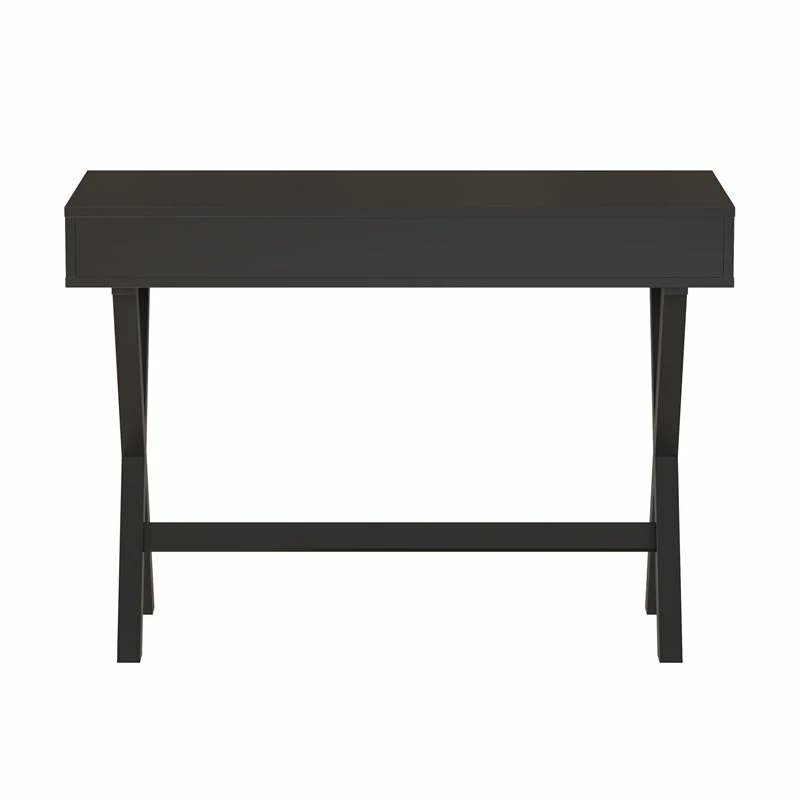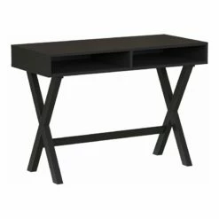 Create a comfortable and stylish place to spend your working or creative hours with this computer desk featuring 2 open storage compartments. Whether you’re working from home, a full time student, or an aspiring writer it’s important to have a space you enjoy spending time in. The smooth rectangular laminate top provides ample room for your desktop or laptop computer and boasts a black finish. This home office desk has 2 open storage nooks to hold important papers and office accessories. Quality construction and superior materials make up this wood writing desk. The strong and durable frame is made from wood and is capable of holding up to 200 pounds static weight capacity. The laminate top protects against chips and scratches and is easily cleaned with a water based cleaner. The integrated floor glides protect floor surfaces when you need a change of scenery in another room. With a medium assembly level, you can have your new desk up and ready to decorate in under 30 minutes. Place this writing desk with drawer in your home office, dorm room or in your small apartment for a one-of-a-kind workspace that will look great for years to come.