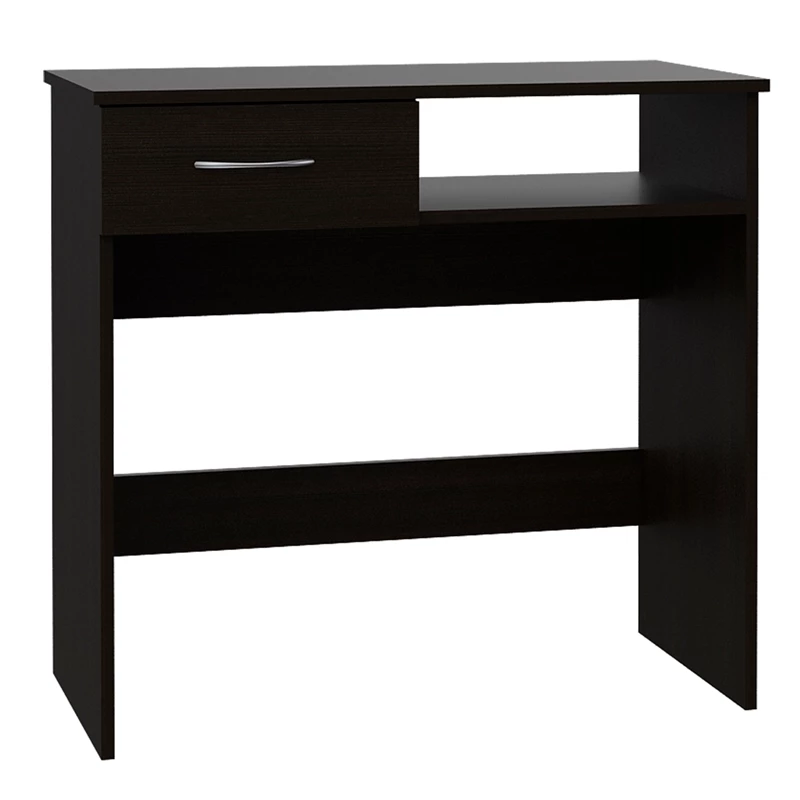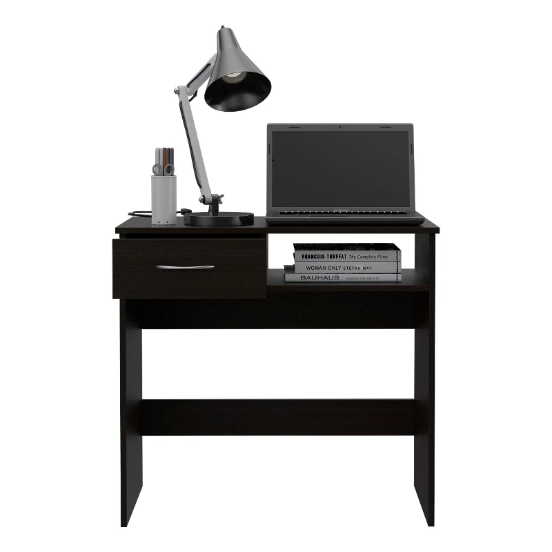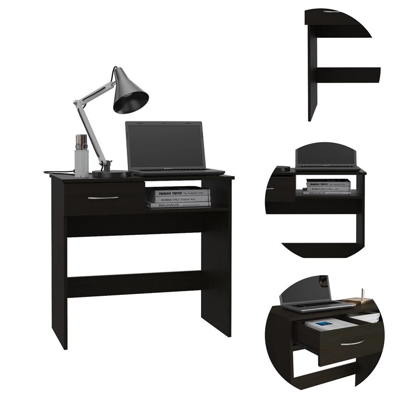 One computer desk with a top surface of 31.5″ W x 15.8″ and 23.2″ of legroom. Includes one drawer and one bottom shelf. Made with particle board in Black wenge finish