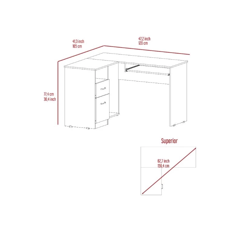 - L shape top surface (41.3″W x 20″ D on one side and 47.2″W x 20″ on the other)