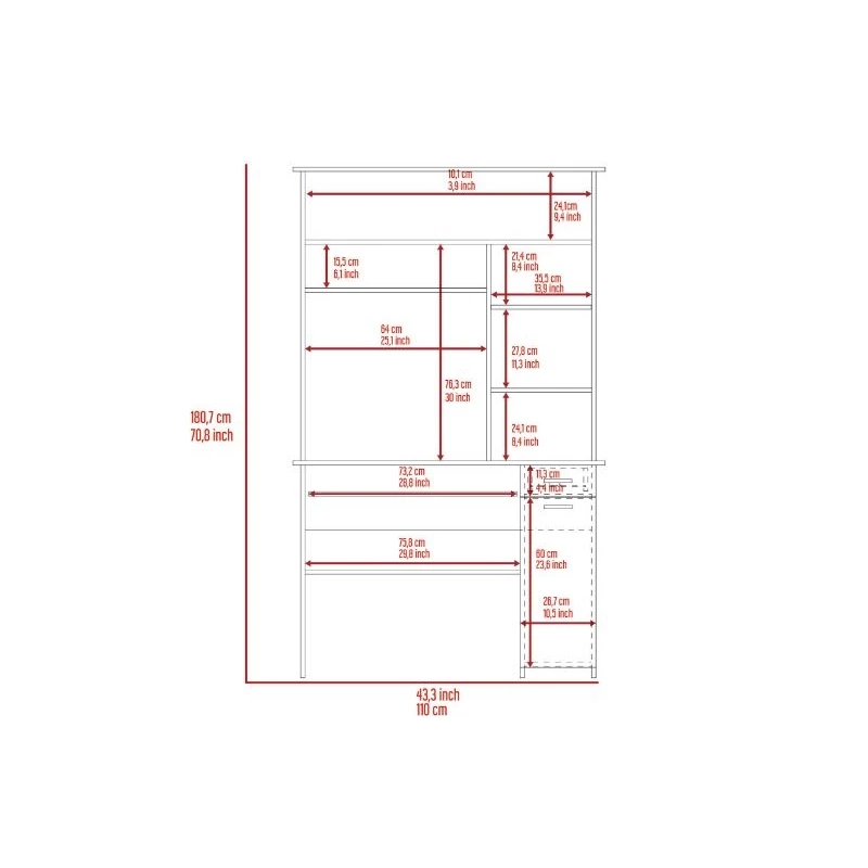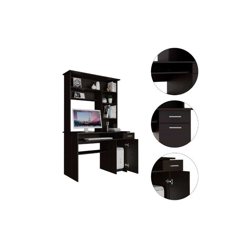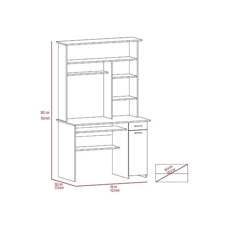 The top surface dimensions are 22.9″ D x 43.3″ W, spacious to fit a monitor screen, write or use your laptop comfortably. The hutch features five spacious shelves where you can put your documents, books, or decoration, and a small drawer will provide concealed storage space.
