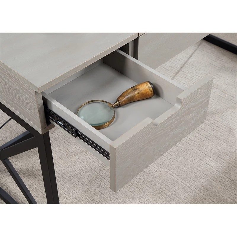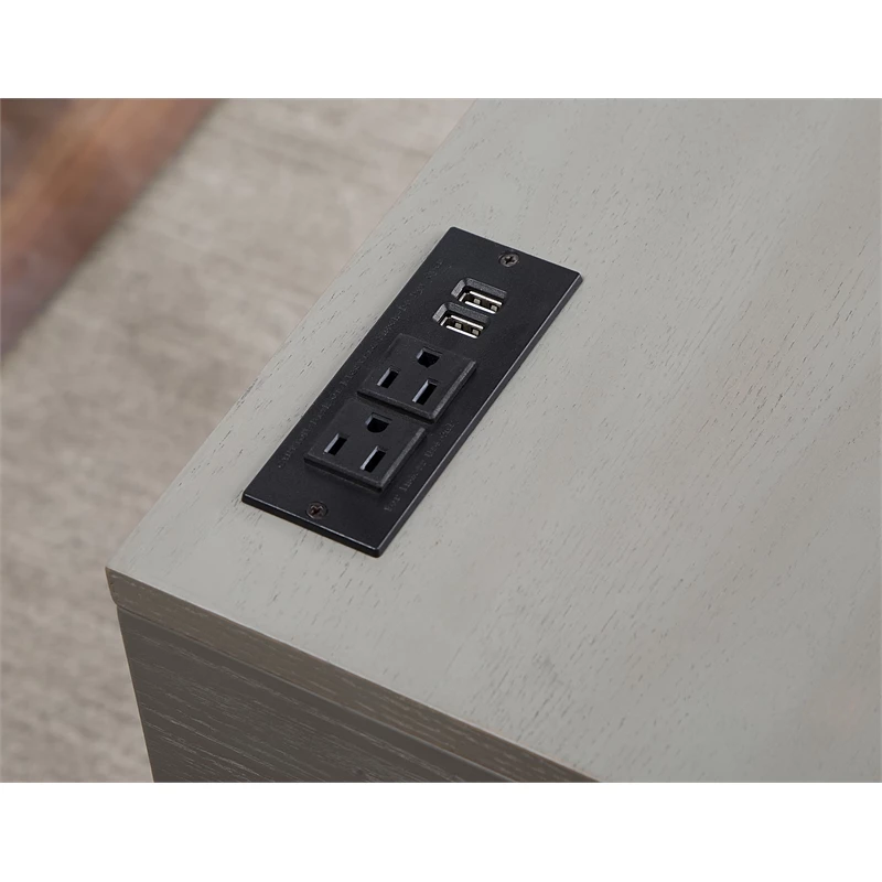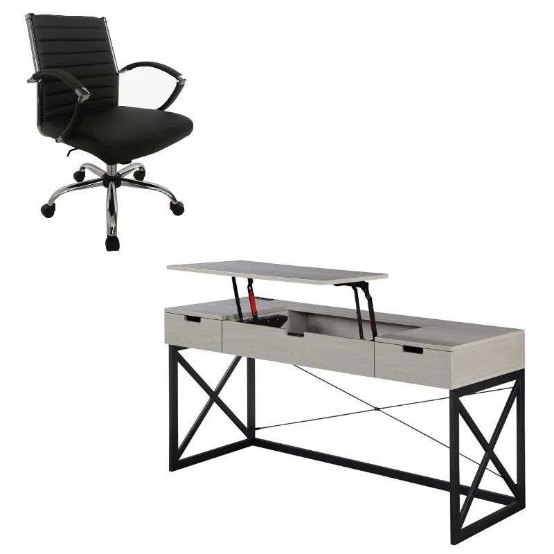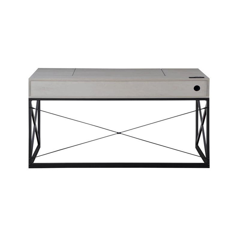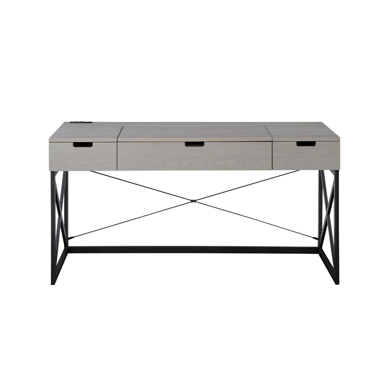Get more done and more space with this 60-inch antique gray wood lift top desk with 2 drawers. The rectangular shape and lift-up function allow you to stand while working. With a sleek wood top and crossed metal base for stability. Two (2) drawers with metal glides allow for plenty of storage. Electrical and USB outlets are built-in for lighting and electronics usage.