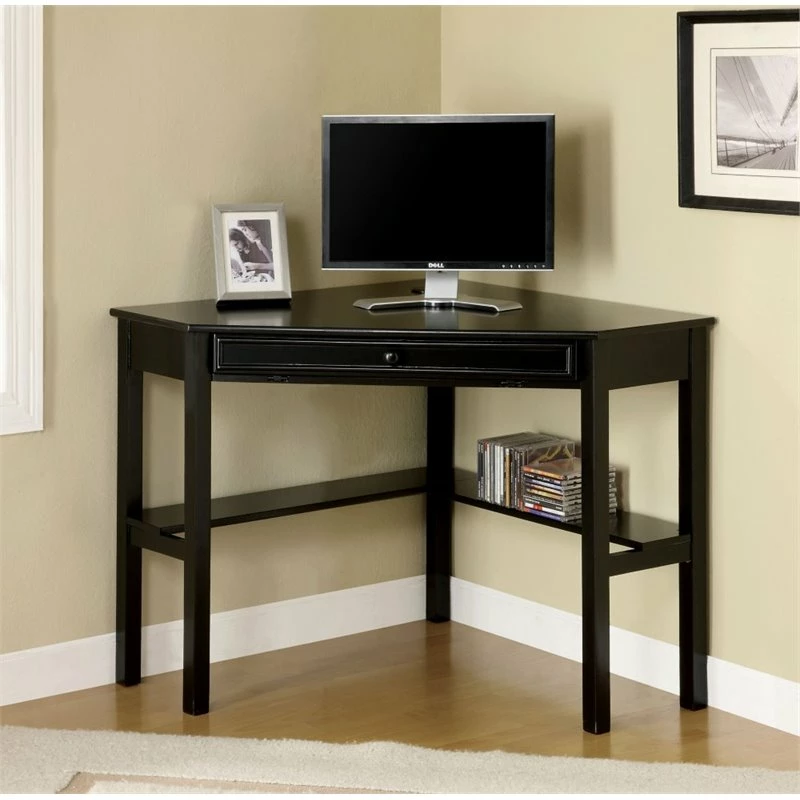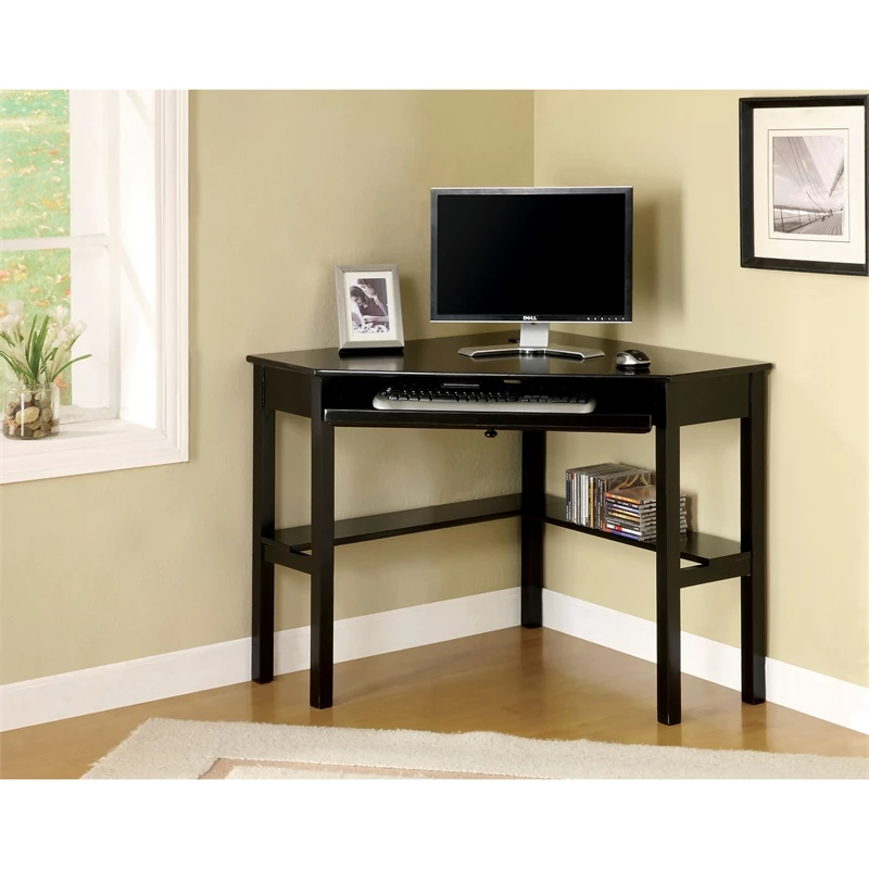 Space-saving and efficient, this corner computer desk sets up a fabulous spot for working or browsing. A corner-hugging design makes maximum use of space as it gives off a stylish ambiance with a solid wood and veneer build joined by metal accents. Bold black offers a dramatic finish to this unit with a drop-down keyboard tray and extra storage space on lower shelving pieces. Make the most of a compact contemporary space with this stylish corner computer desk.