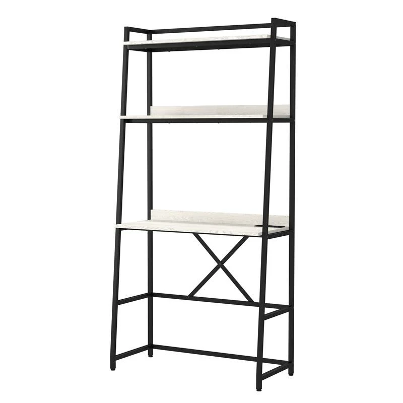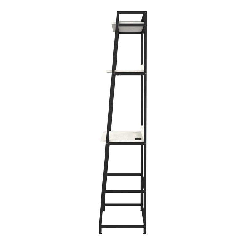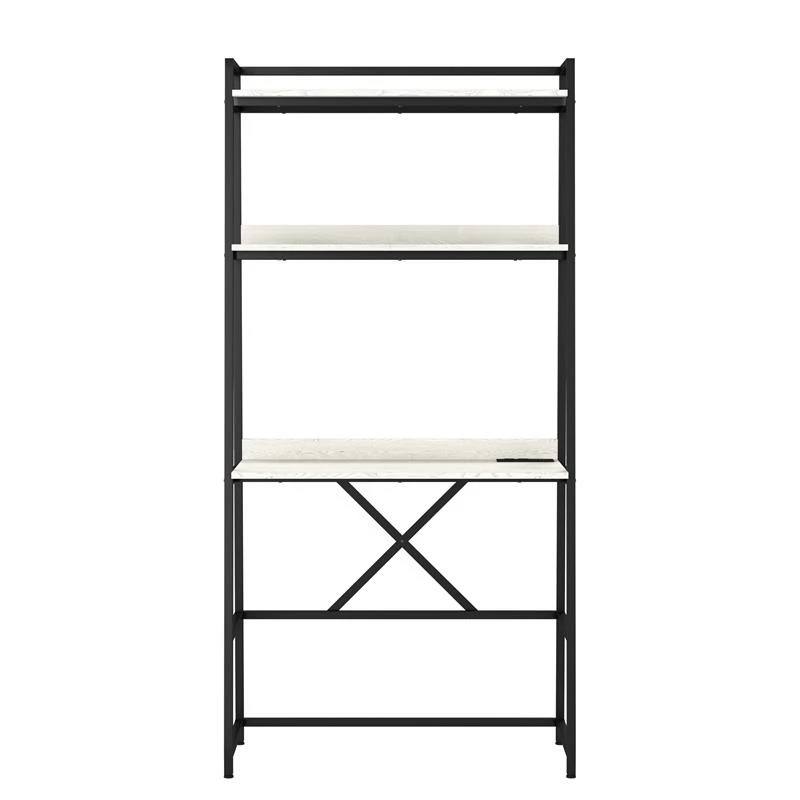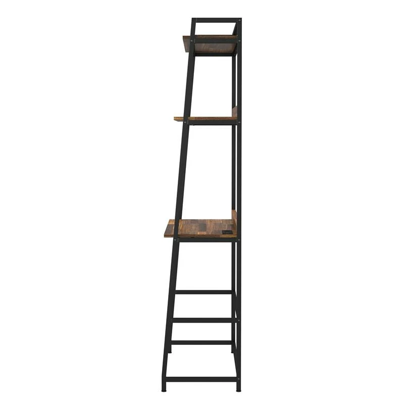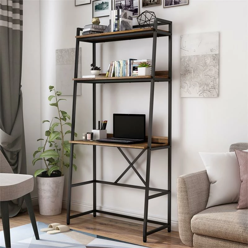 Perfect for that occasional work-from-home day or for easy online browsing from your tablet or laptop, this tall brown and black writing desk is a minimalist design with modern angularity. It’s ideal for a shared family space and offers both power and USB outlets in the desktop for easy access to charge a phone or Bluetooth devices. This tall, wood bookcase desk design features a metal frame in a black finish, complete with angled supports and an X-cross brace for added stability.