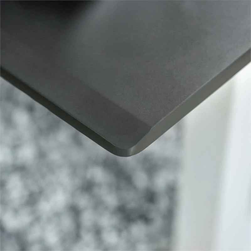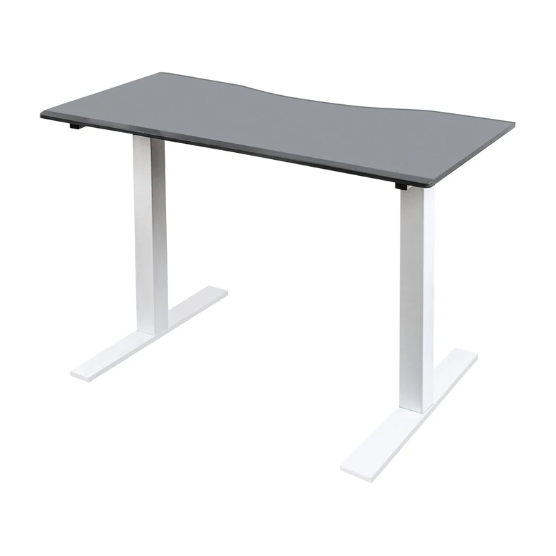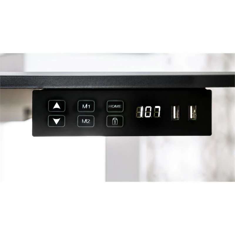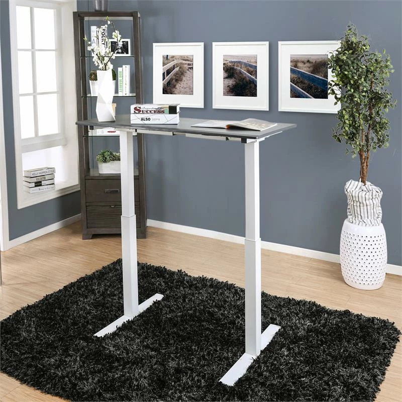 The gray finish metal desk offers efficiency and space-saving bonuses. With its convenient height-adjustable design, the electronically inclined desk allows you to select between two heights for different work modes, and features built-in USB charging so you can work without interruptions. The extra-wide tabletop is gently rounded along the front so you can get up and personal with your work while the sturdy base ensures strength and stability. Made from solid wood and wood veneer.