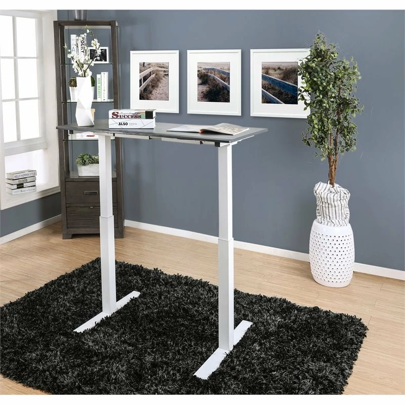 The gray finish metal desk offers efficiency and space-saving bonuses. With its convenient height-adjustable design, the electronically inclined desk allows you to select between two heights for different work modes, and features built-in USB charging so you can work without interruptions. The extra-wide tabletop is gently rounded along the front so you can get up and personal with your work while the sturdy base ensures strength and stability. Made from solid wood and wood veneer.