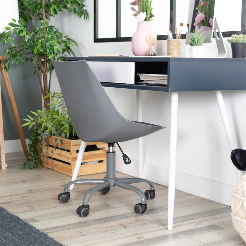 Give your home office a modern refresh with this desk chair. The bucket-style armless chair is made from molded plastic, making it easy to wipe down and clean. A padded, foam-filled seat cushion offers an inviting look and a comfortable feel when you’re working long hours to get the job done. This task chair is set on a 5-star base with casters, plus the swivel seat, meaning you can easily move around your office. Also, a convenient lever lets you adjust the seat height to suit your needs. Whether you’re sitting in class, studying for a final exam, or working to beat a tight deadline, this stylish chair will keep you cool and comfortable throughout your busy day.