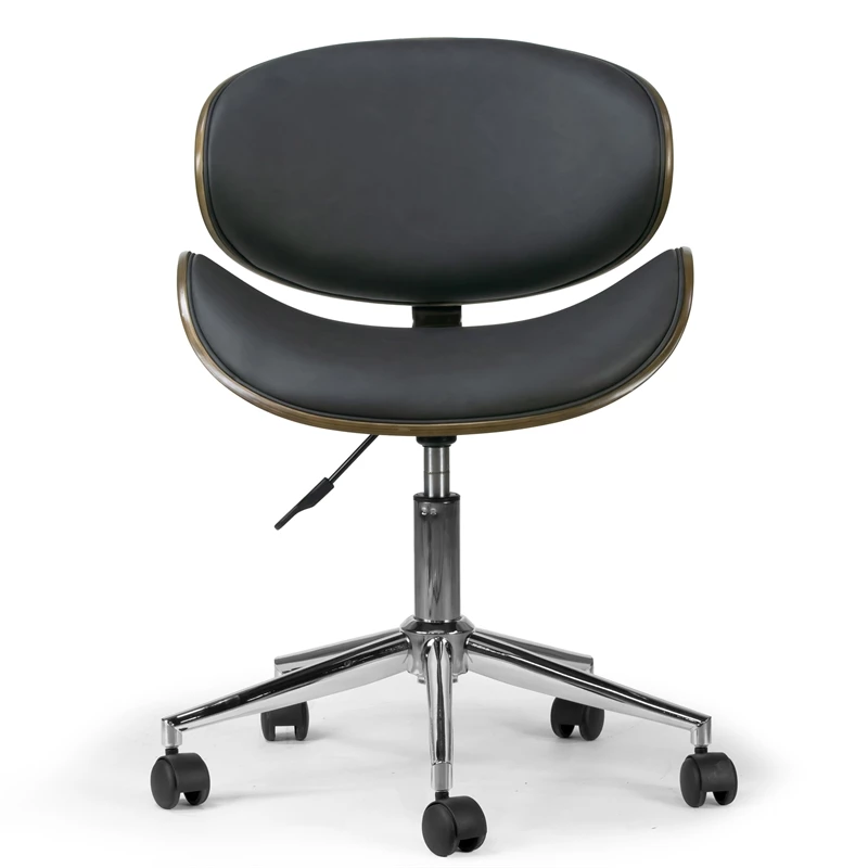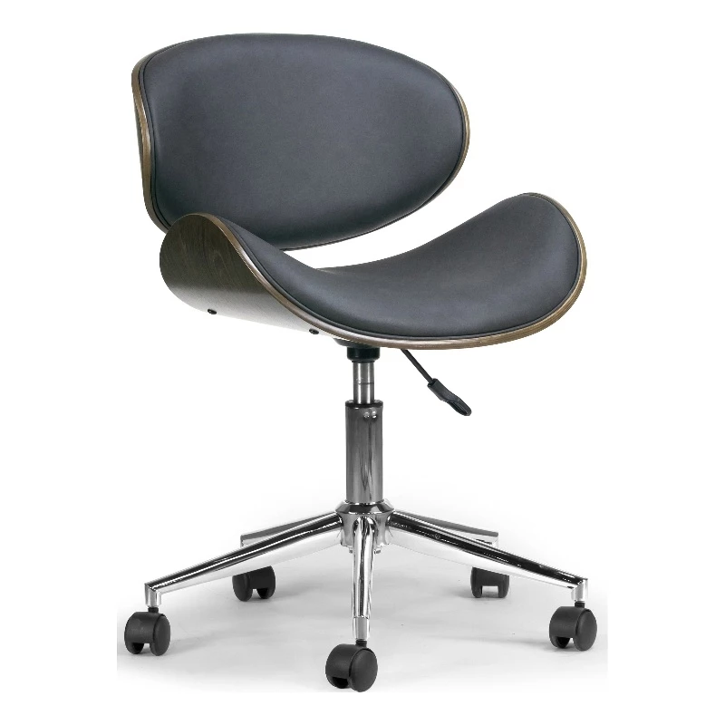 Modern dark Gray upholstered adjustable height swivel office chair with dark Gray plywood bentwood back and seat frame. Generously thick cushions provide comfort even for long time seating. High quality chrome finish metal frame with wheel base is steady and durable. This office is height-adjustable and swivels 360 degrees. Minor assembly needed. Wipe clean with dry cloth.