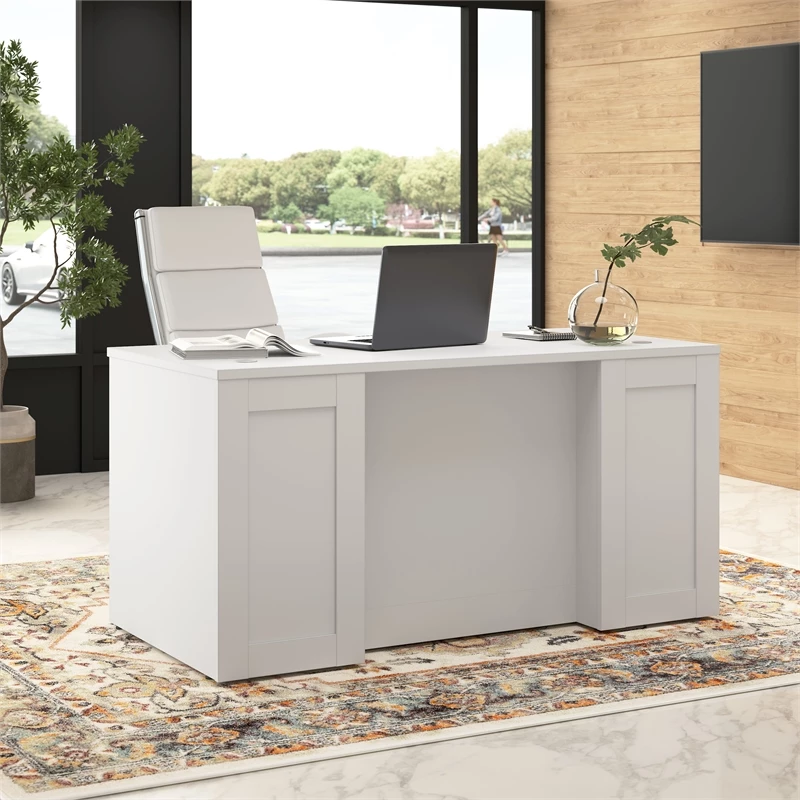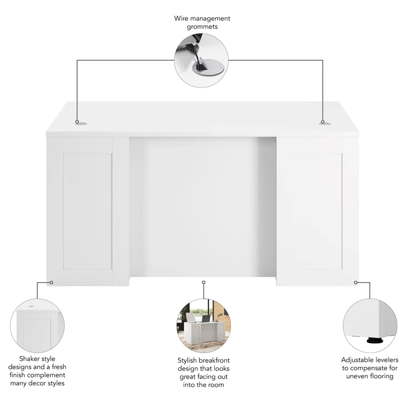 Highlighted by its distinctive breakfront design, the Bush Business Furniture Hampton Heights 60W x 30D Executive Desk transforms any workspace into a captivating reflection of today’s professional. Durable thermally fused laminate finish fends off scratches and stains to preserve the office desk’s upscale appearance while standing up to the rigors of a 40-plus hour work week. Base features adjustable levelers to compensate for uneven floors. 2 built-in wire management grommets are included. Shaker style designs and a fresh finish work perfectly in transitional and contemporary interiors. This computer desk is backed by a 10 Year Manufacturer’s Warranty and meets ANSI/BIFMA quality test standards for safety and performance. See the full collection for coordinating items available to make your office your own with Hampton Heights. North American made with globally sourced materials.