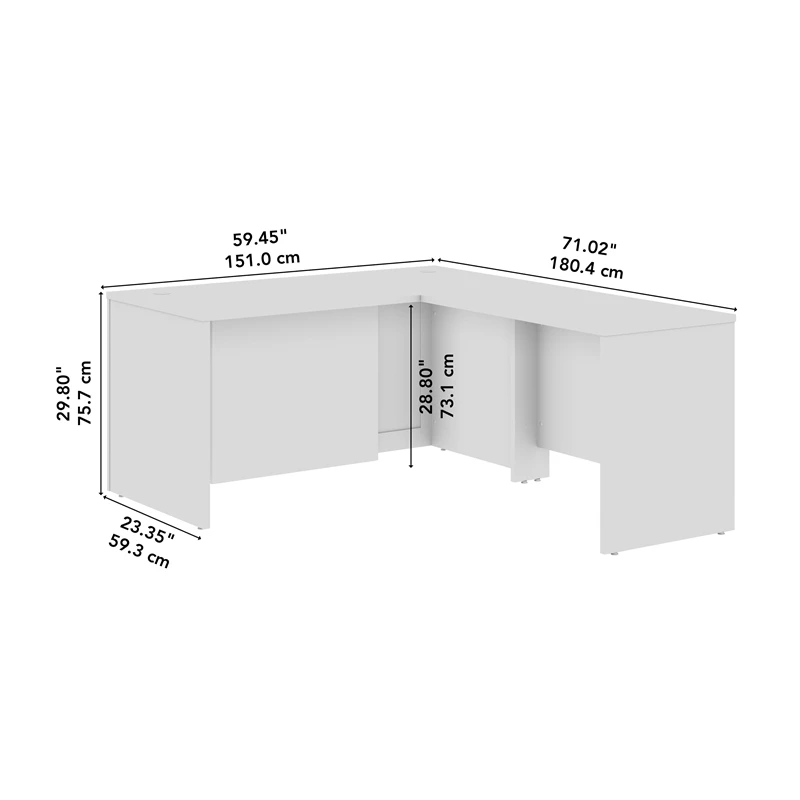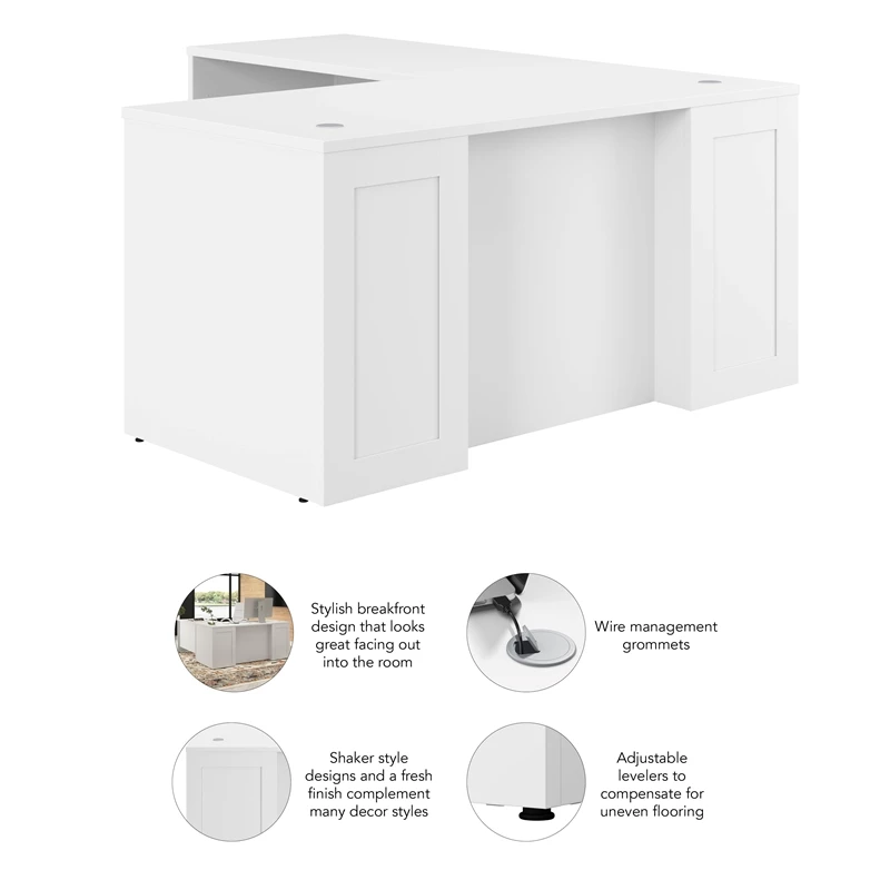 Highlighted by its distinctive breakfront design, the Bush Business Furniture Hampton Heights 60W x 30D Executive L-Shaped Desk transforms any workspace into a captivating reflection of today’s professional. Durable thermally fused laminate finish fends off scratches and stains to preserve the office desk’s upscale appearance while standing up to the rigors of a 40-plus hour work week. Return attaches to either side of Hampton Heights Desks to create L or U Shaped configurations with a right or left handed layout. Shaker style designs and a fresh finish work perfectly in transitional and contemporary interiors. 2 built-in wire management grommets keep cords and cables out of the way. This computer desk is backed by a 10 Year Manufacturer’s Warranty and meets ANSI/BIFMA quality test standards for safety and performance. North American made with globally sourced materials.