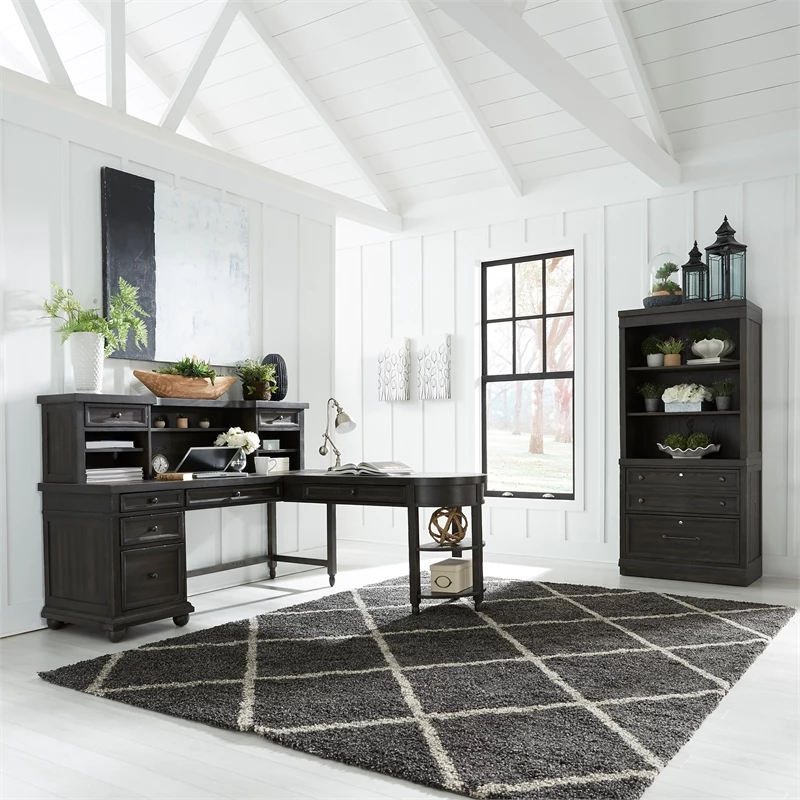 Work from home in comfort and style with the Harvest Home L shaped desk set. Crafted of rubberwood solids with knotty white oak veneers, this desk features a chalkboard finish with saw cut hewing, full extension drawer glides for easy access to storage, five interior storage drawers, including two flip down keyboard drawers and a locking file drawer, bottom case dust proofing to protect contents, three adjustable shelves within the hutch allowing for customization, and additional storage with the shelving at the end of the curved shape return. The hutch features a center monitor cut out that is flanked by two interior storage drawers and two cubbies and planked top and side panels. Each piece in this set is accented by antique pewter knob hardware. This set effortlessly creates a casual look with a classic feel. With today’s modern technology in mind, this set features a built-in charging station with two plugs and two USB ports, making multi device charging a breeze. This item comes in alternate finishes, sure to be a great addition to any home.