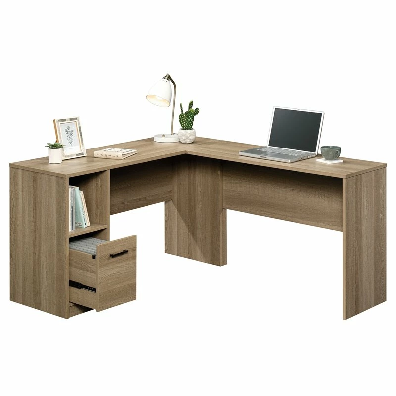 It’s time to take care of business! Find the motivation you need to tackle all your projects when you add the beautiful style and increased functionality of this L-shaped desk from the Home Square collection. This home office desk offers a spacious top surface that provides you with all the room you need for desk essentials like your laptop, stacks of folders, notepads and your hot cup of coffee. There’s also plenty of space for home décor items like an Accent lamp and framed photos. The lower file drawer with full extension slides can hold letter-size hanging files so you can keep all your important documents organized. The open shelf cubbyhole provides you with additional storage space for miscellaneous office supplies like envelopes and your stapler. This desk is finished on all sides for versatile placement throughout your home. Finished in Summer Oak, this L-shaped will have you feeling ready to work!
