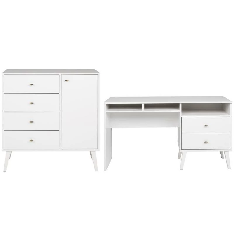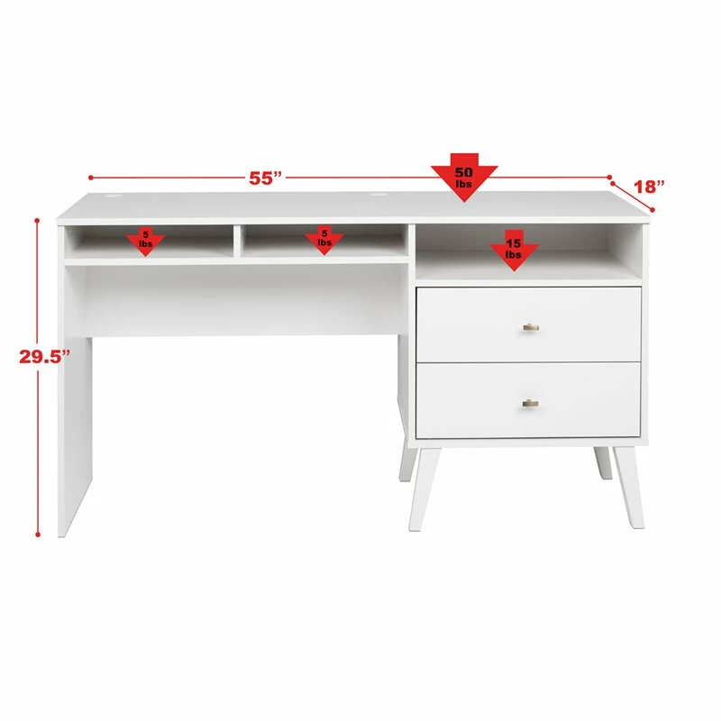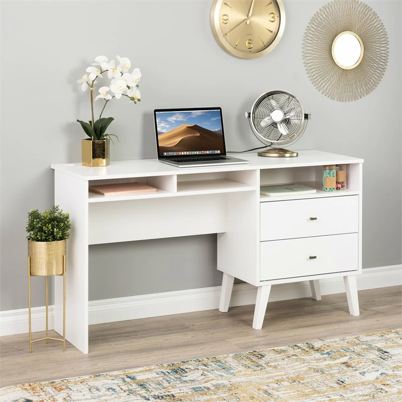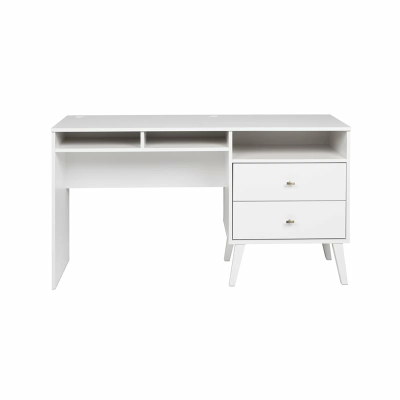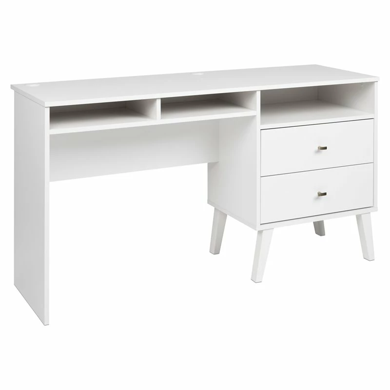 With a sleek mid-century modern design, the Home Square Computer Desk with Side Storage and 2 Drawers adds a touch of vintage to your home office. A large 55 x 18 inches desktop provides room for a computer as well as other workspace necessities. The two medium-sized compartments are ideal for notebooks and supplies, while the 21.25 inches wide compartment above the drawers makes a great place to stash away your laptop or other devices. There are two covered circular grommets for wire management and the Home Squarevacy panel is positioned slightly forward to allow access to electrical outlets. The two drawers run smoothly on metal glides with safety stops and provide ample storage to keep your workstation tidy. The tapered solid wood legs and brushed brass finished knobs deliver a clean and modern look and makes this sturdy desk the perfect complement to the Home Square Bedroom Collection. It is constructed from durable, clean, CARB-2 compliant, laminated composite woods and includes an instruction manual to guide you through assembly.